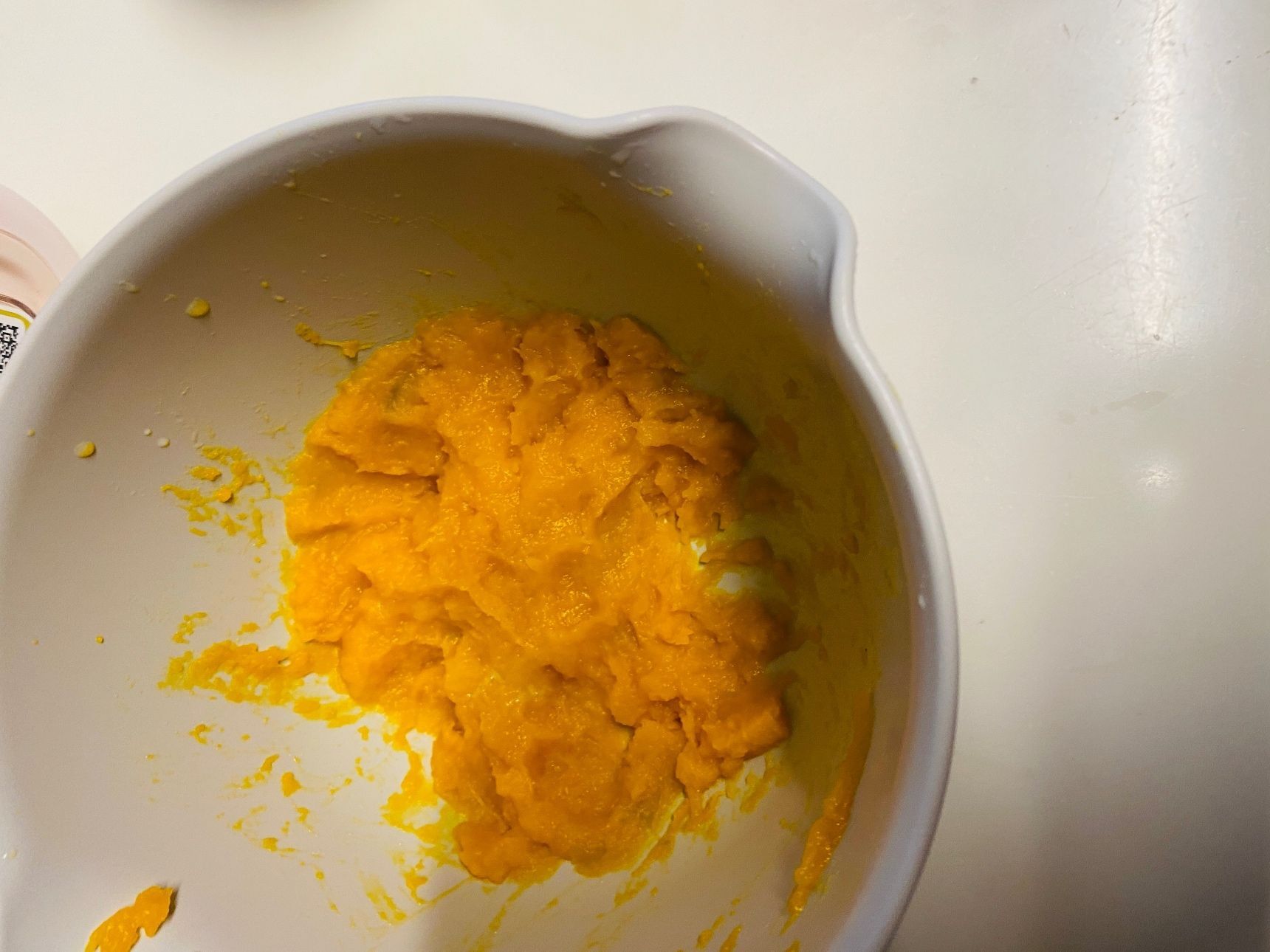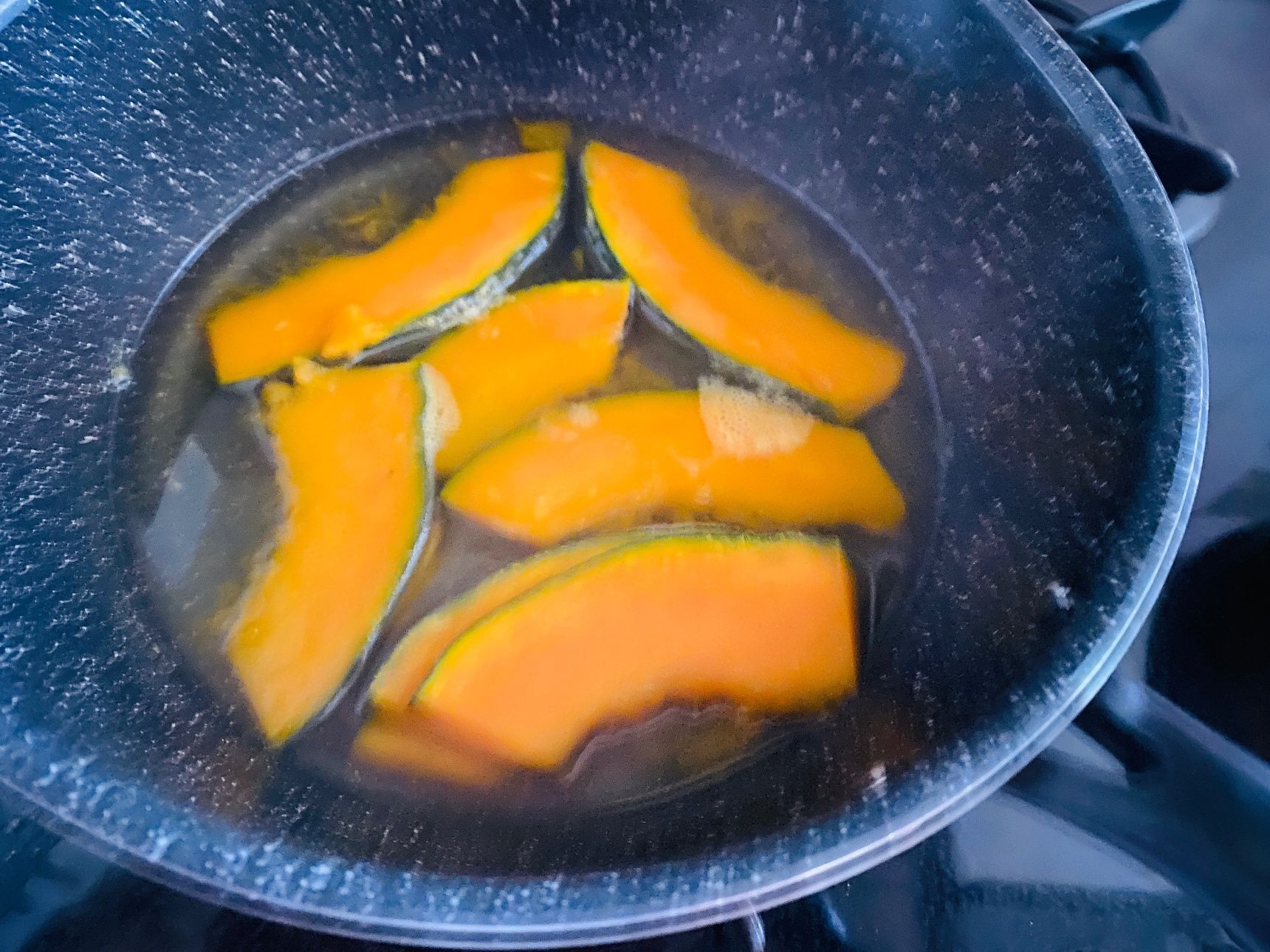 ①かぼちゃは、スライスして、かぶるくらいの水を入れクタクタに煮ます。