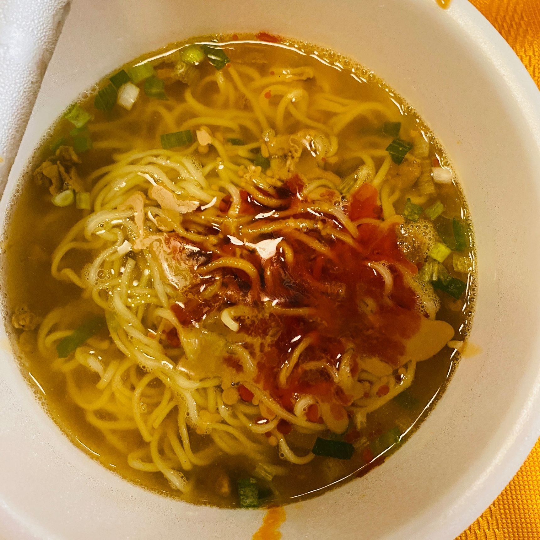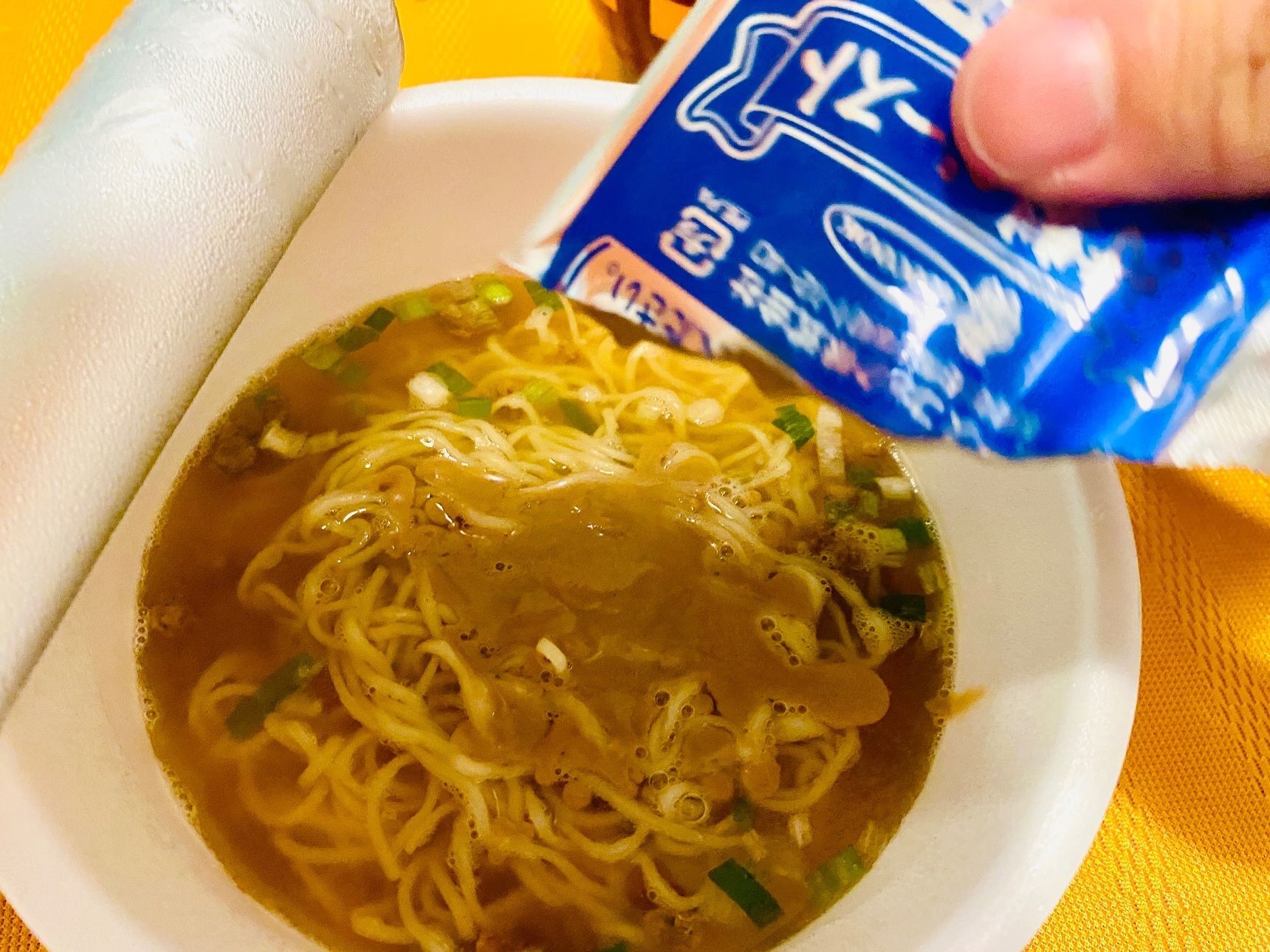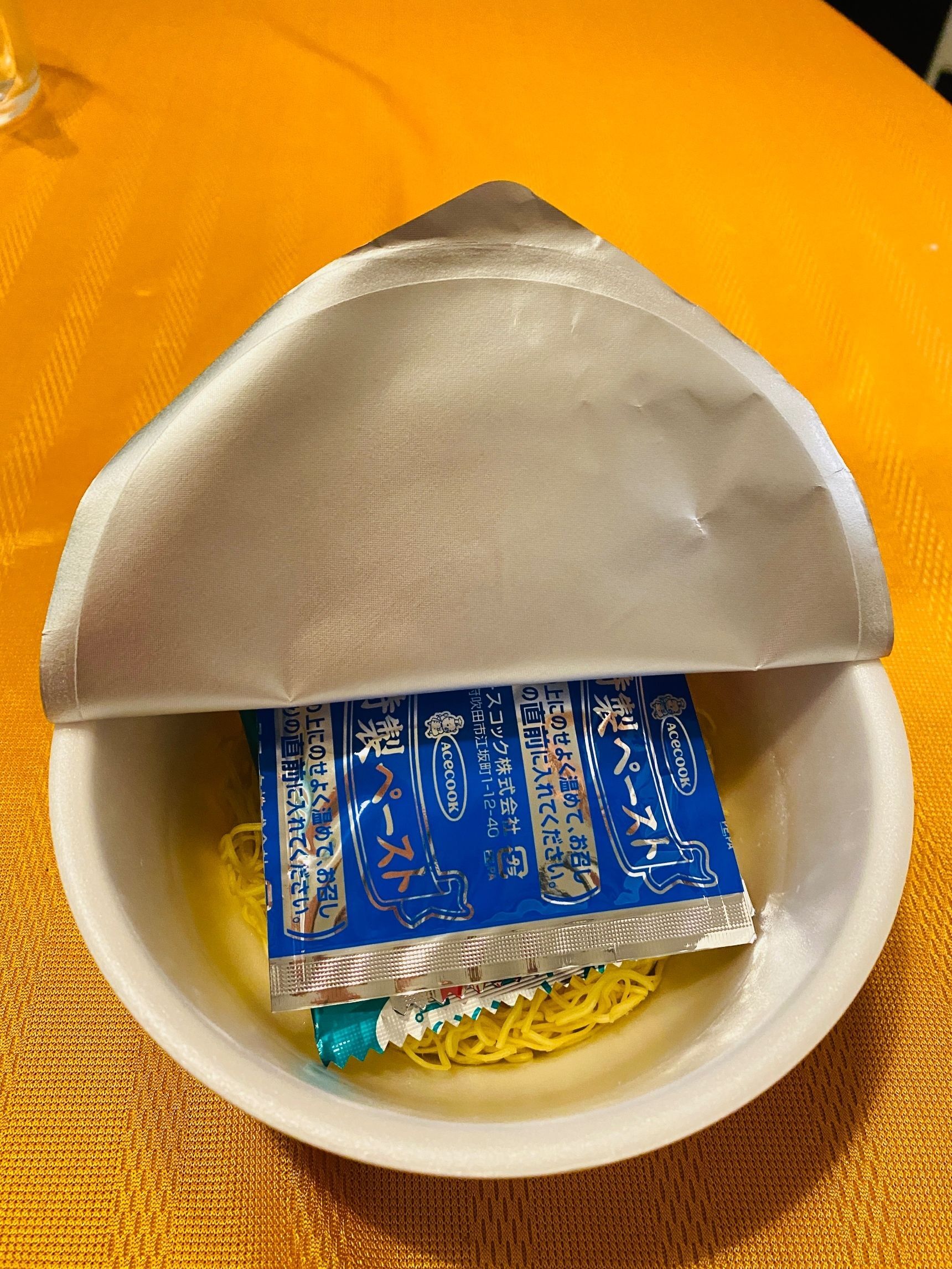 熱湯を360ml目盛まで入れて、かやく入り粉末スープ(緑)、液体スープ(赤)も入れて、待つこと5分です。