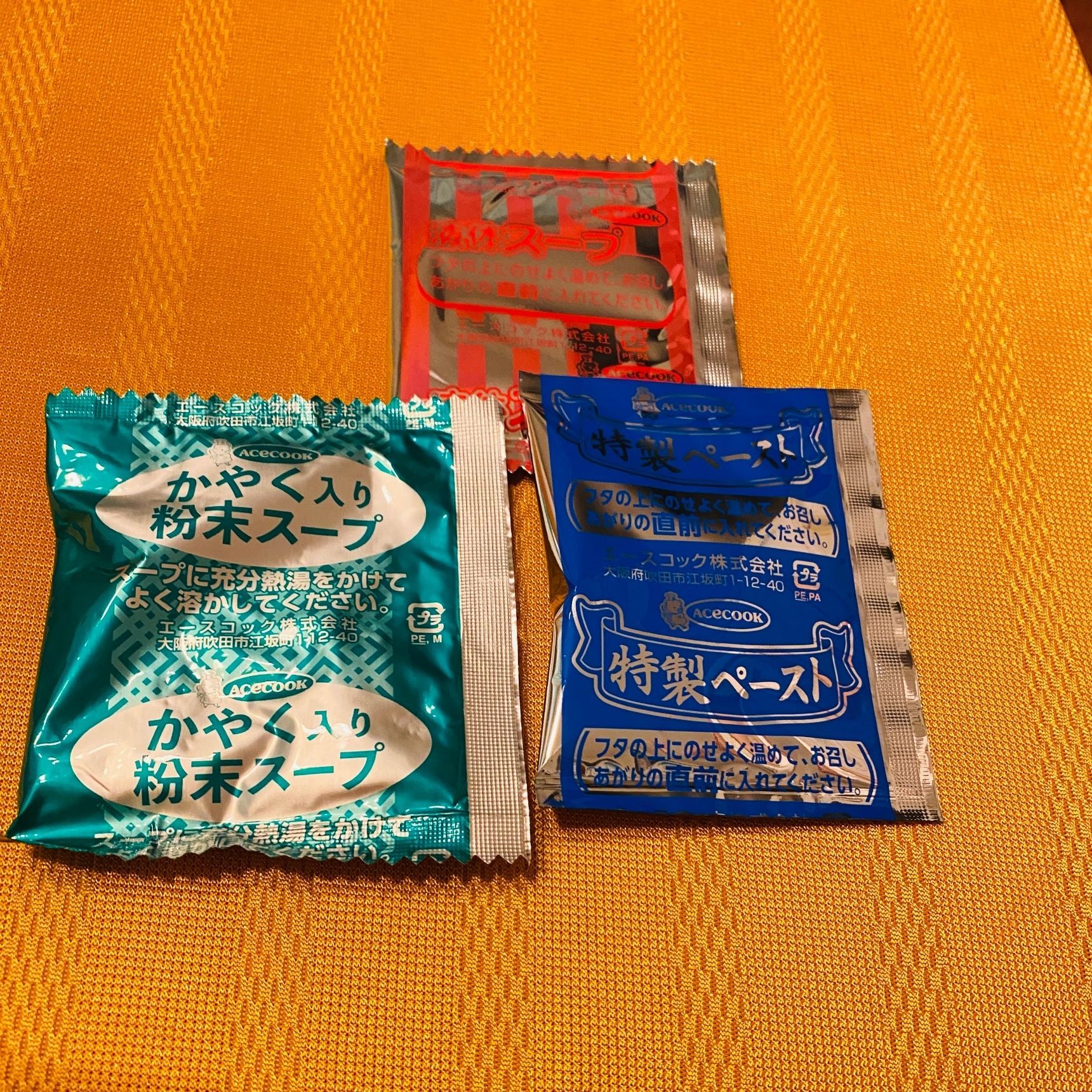 麺に同梱されていたのは、かやく入り粉末スープ(緑)、液体スープ(赤)、直前に入れる特製ペースト(青)の3点です。