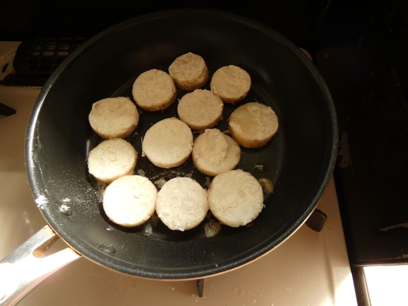 フライパンに油をひき、長芋を並べて焼きます。