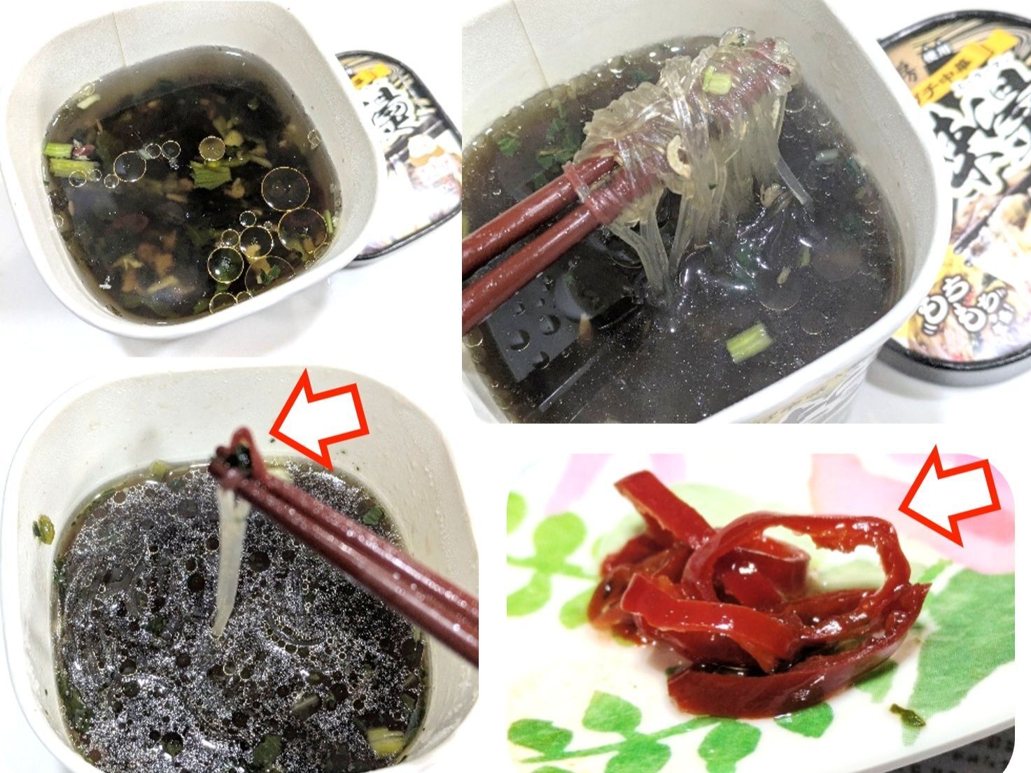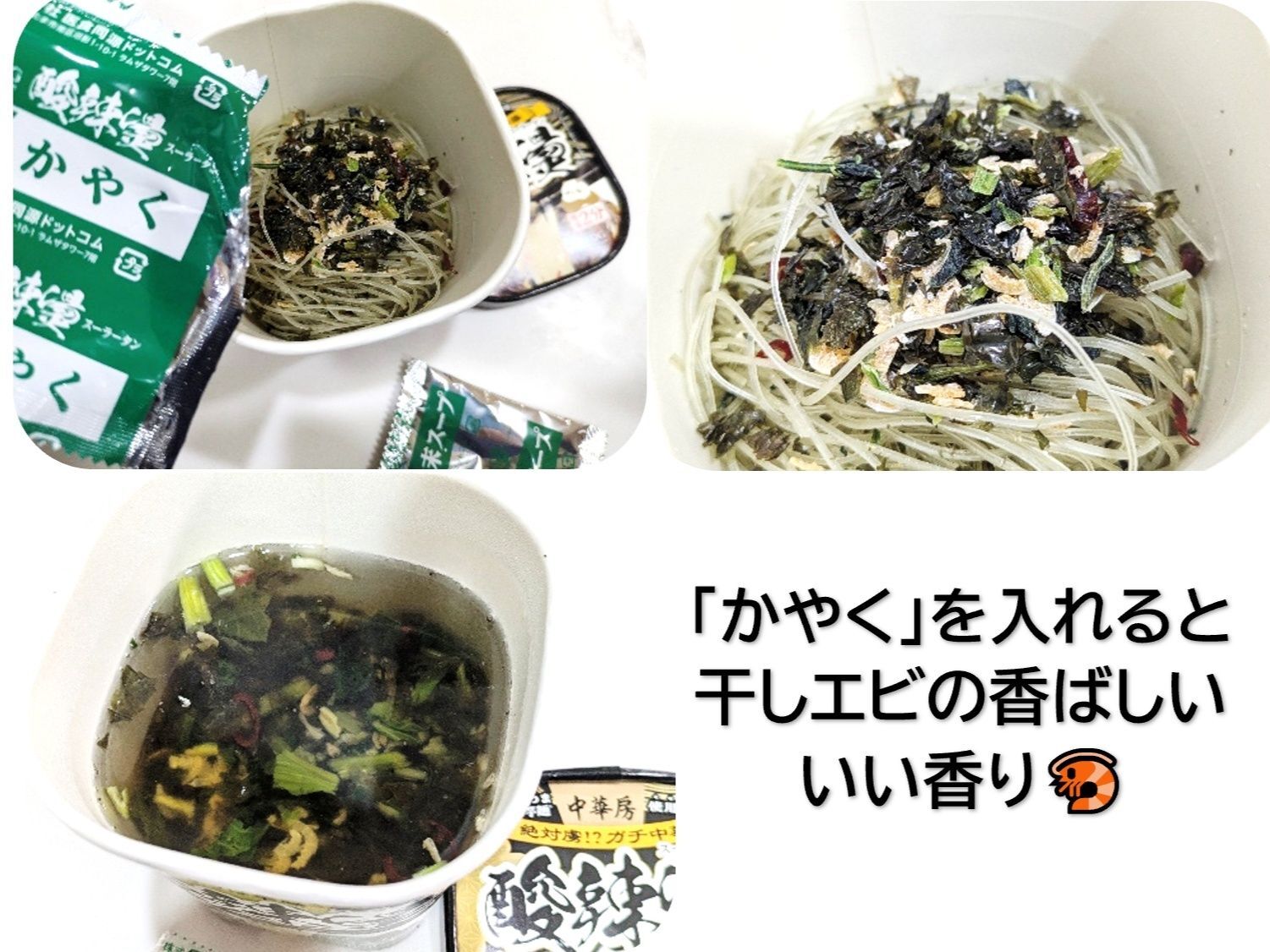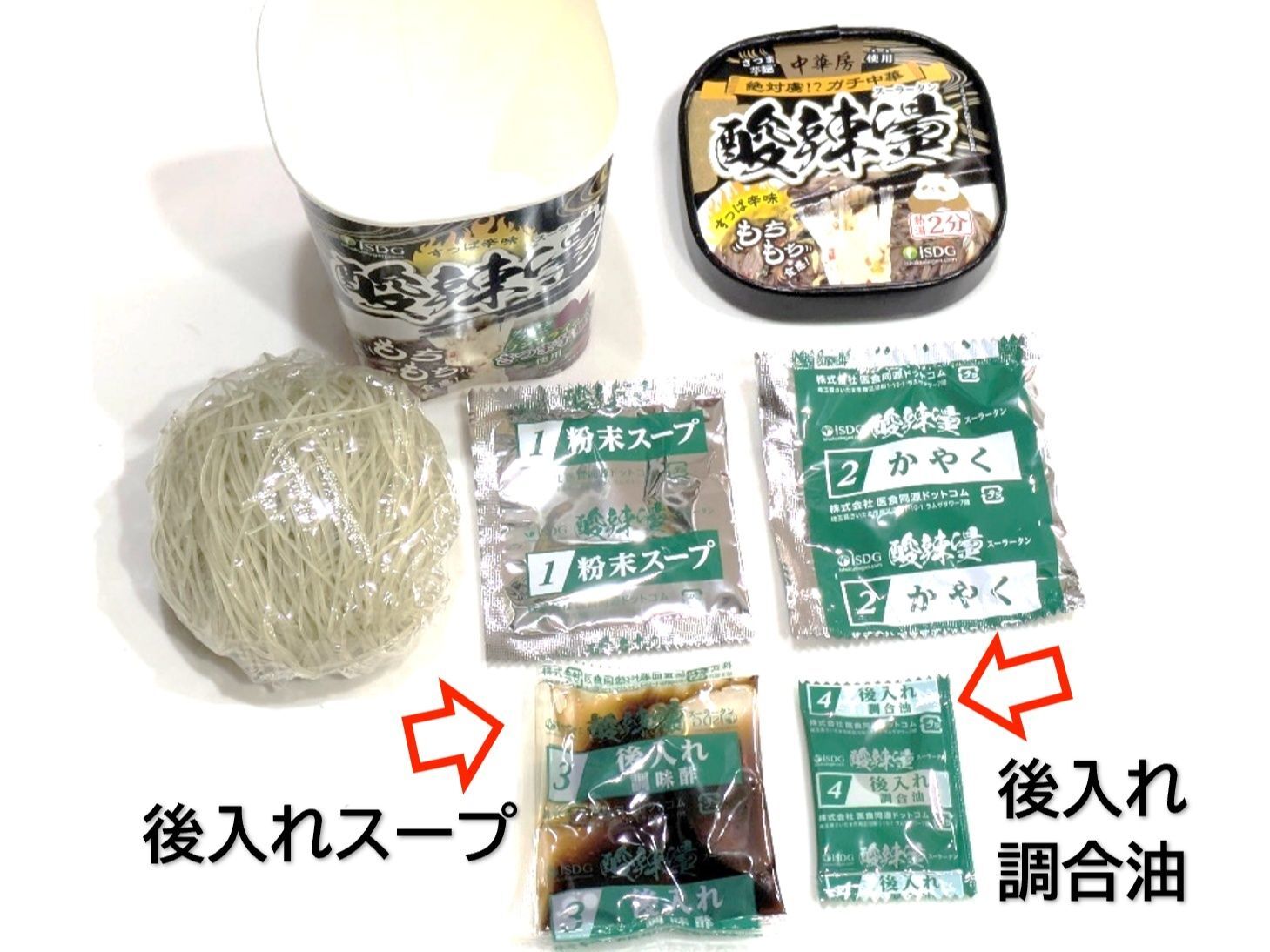 春雨、粉末スープ、かやく、後入れスープ、後入れ調合油