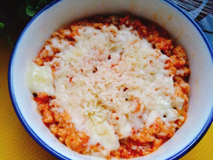 オートミールにキムチとコチュジャンを混ぜ合わせてちゃんとご飯。