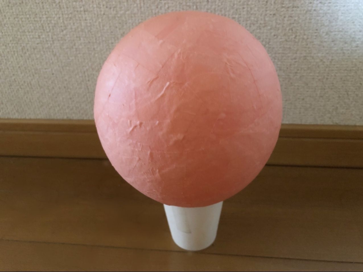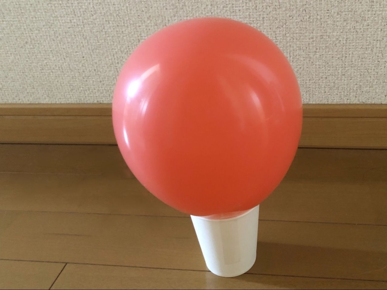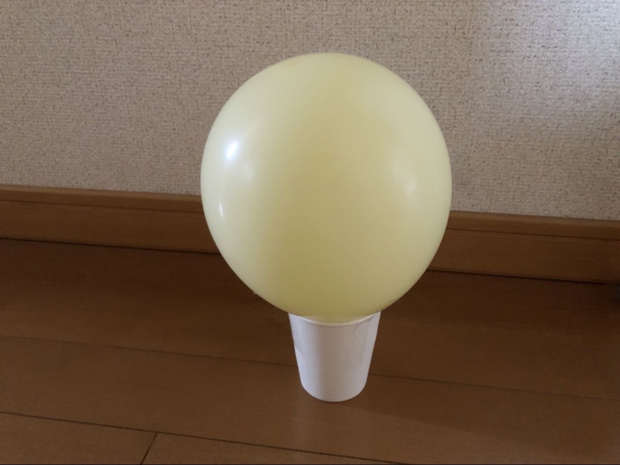 風船をほど良い大きさに膨らませ、紙コップと風船をセロハンテープで固定します。