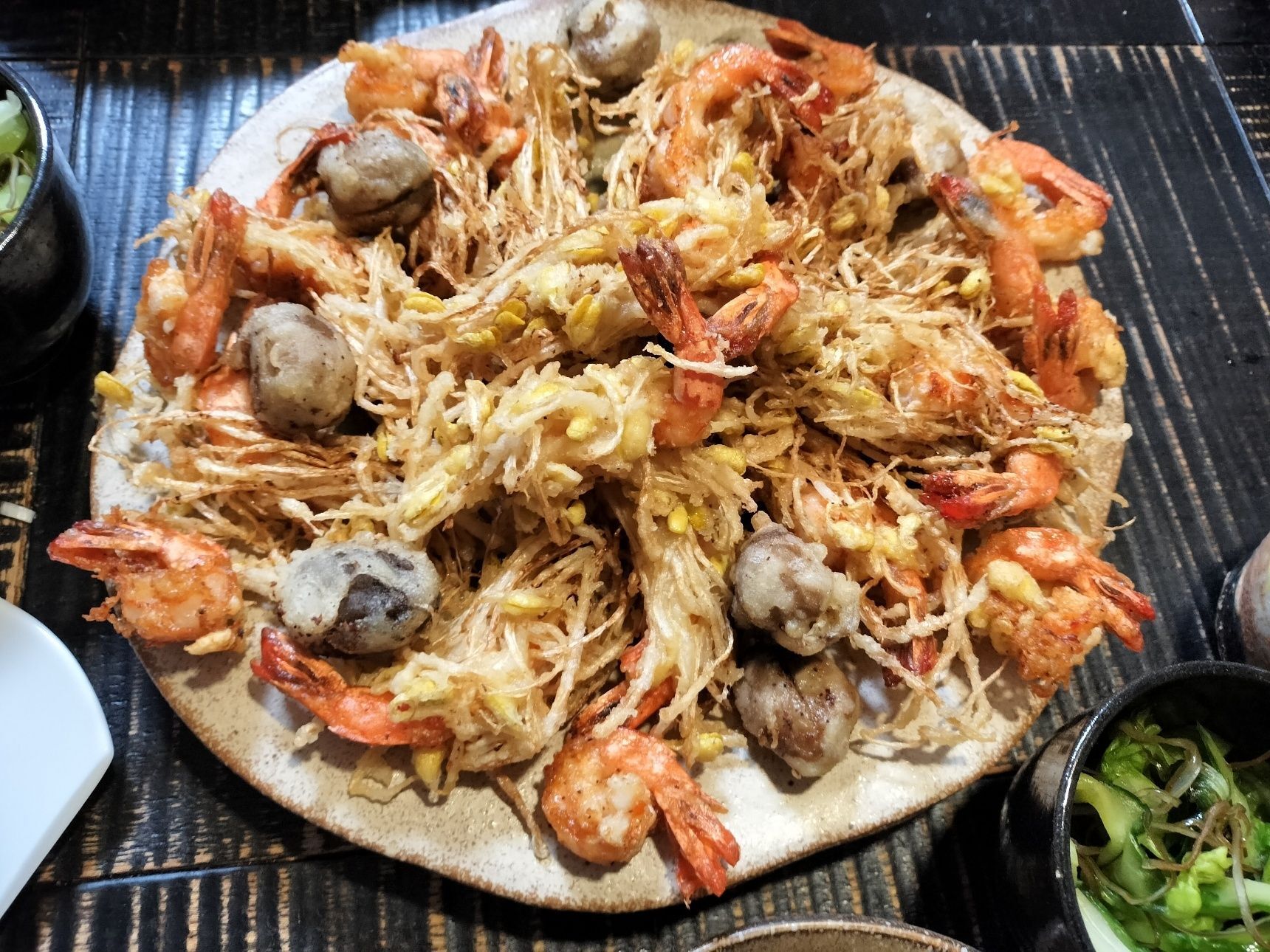 豆もやし入りサクサク香ばしい衣とXO醤で下味をつけた海老、タレ(魚醤ダレや塩ダレ)が相まって、絶妙な味わい!