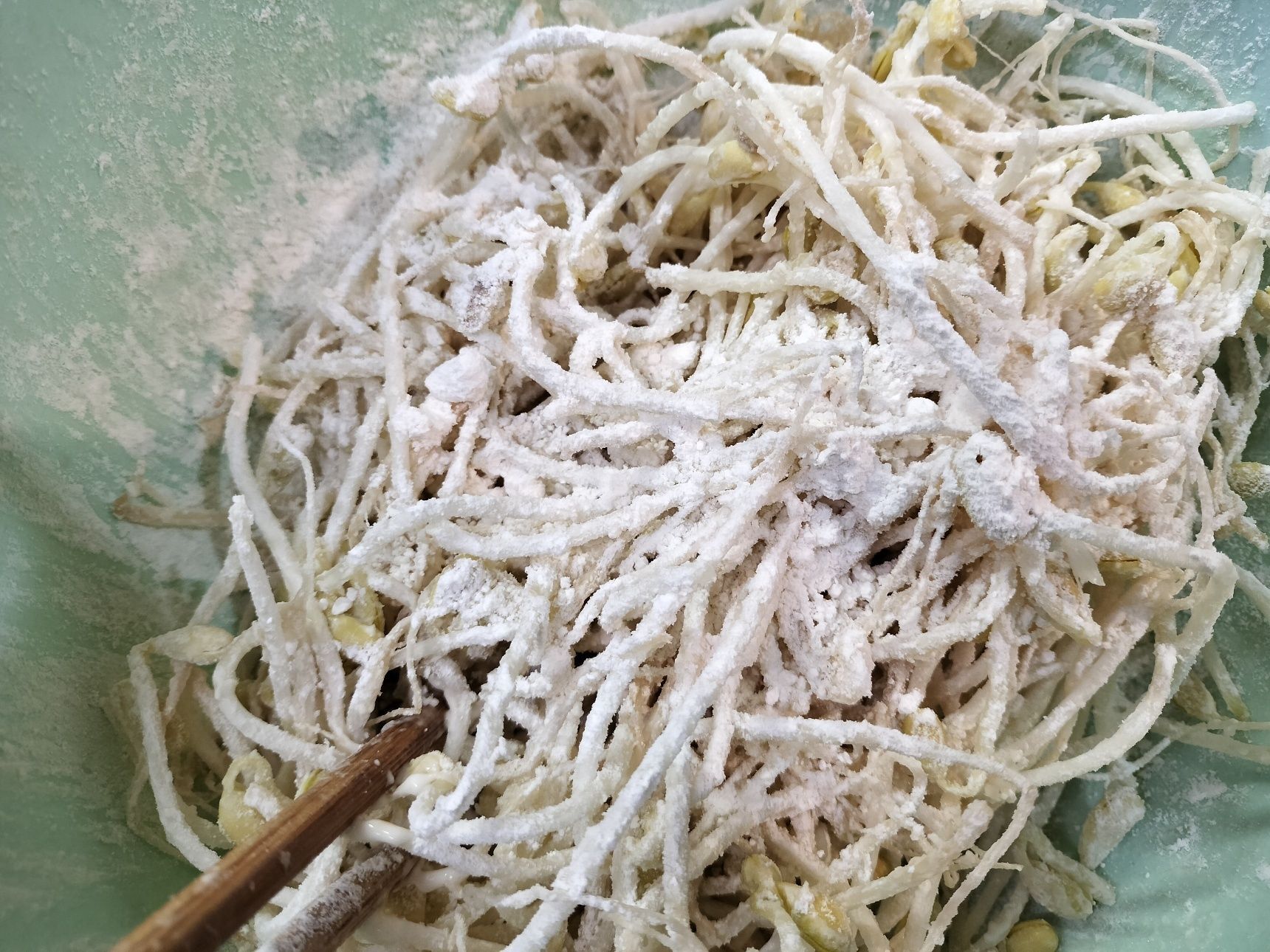 3、別ボウルに豆もやしを入れる→小麦粉をまぶして混ぜる