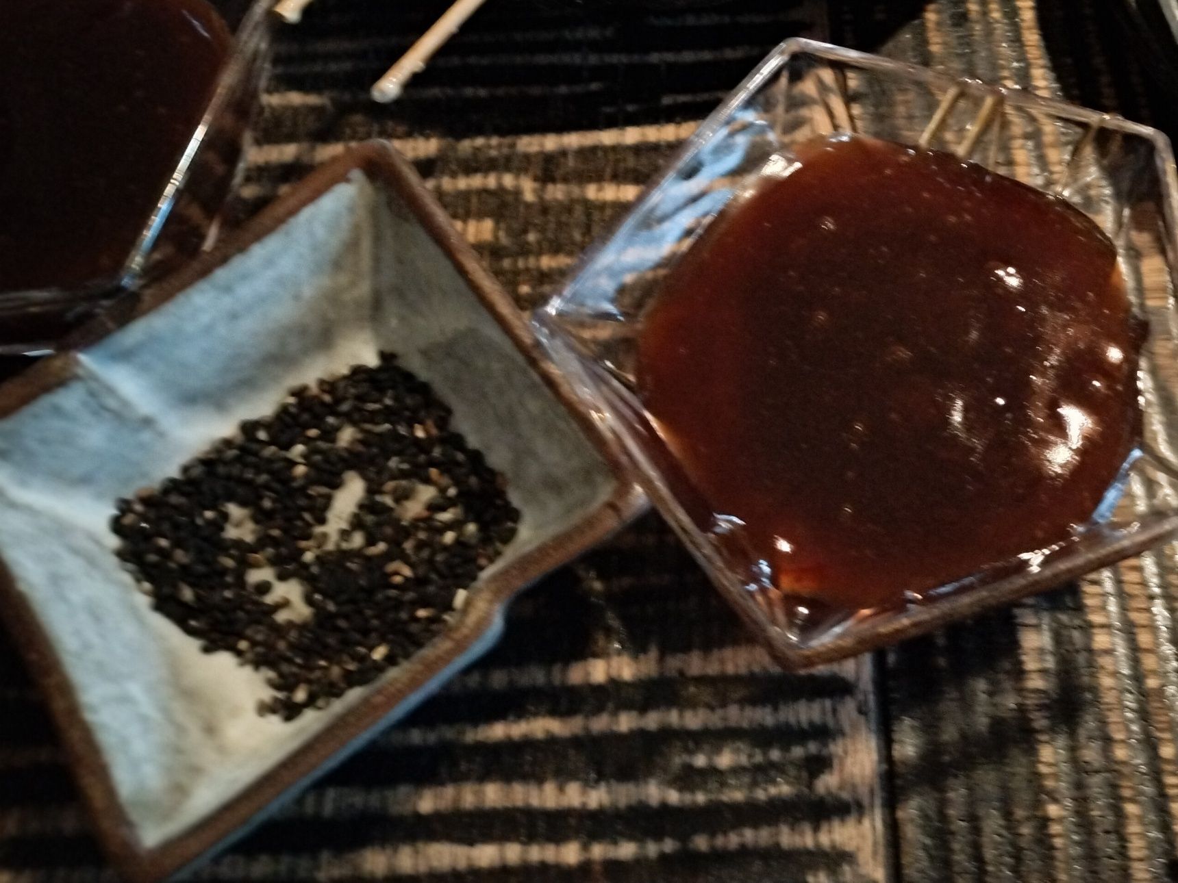 美味しい甘辛いみたらし団子のタレと炒りごま(黒)をつけて、いただきまーす!