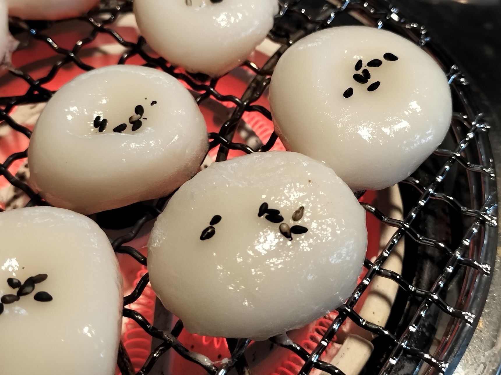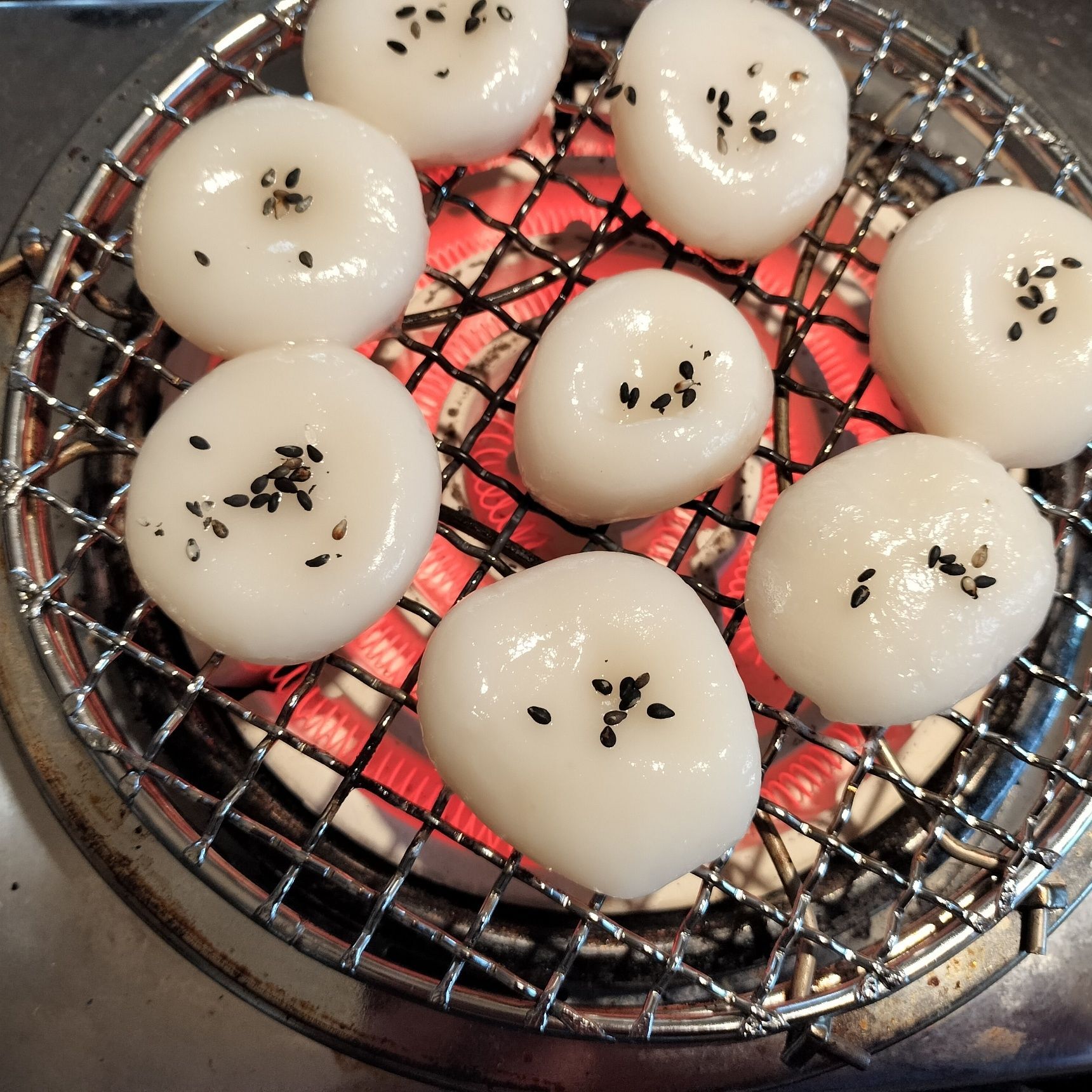 7、網に、白玉をのせる→炒りごま(黒)をかける→軽く両面を炙り、膨らんだら完成!