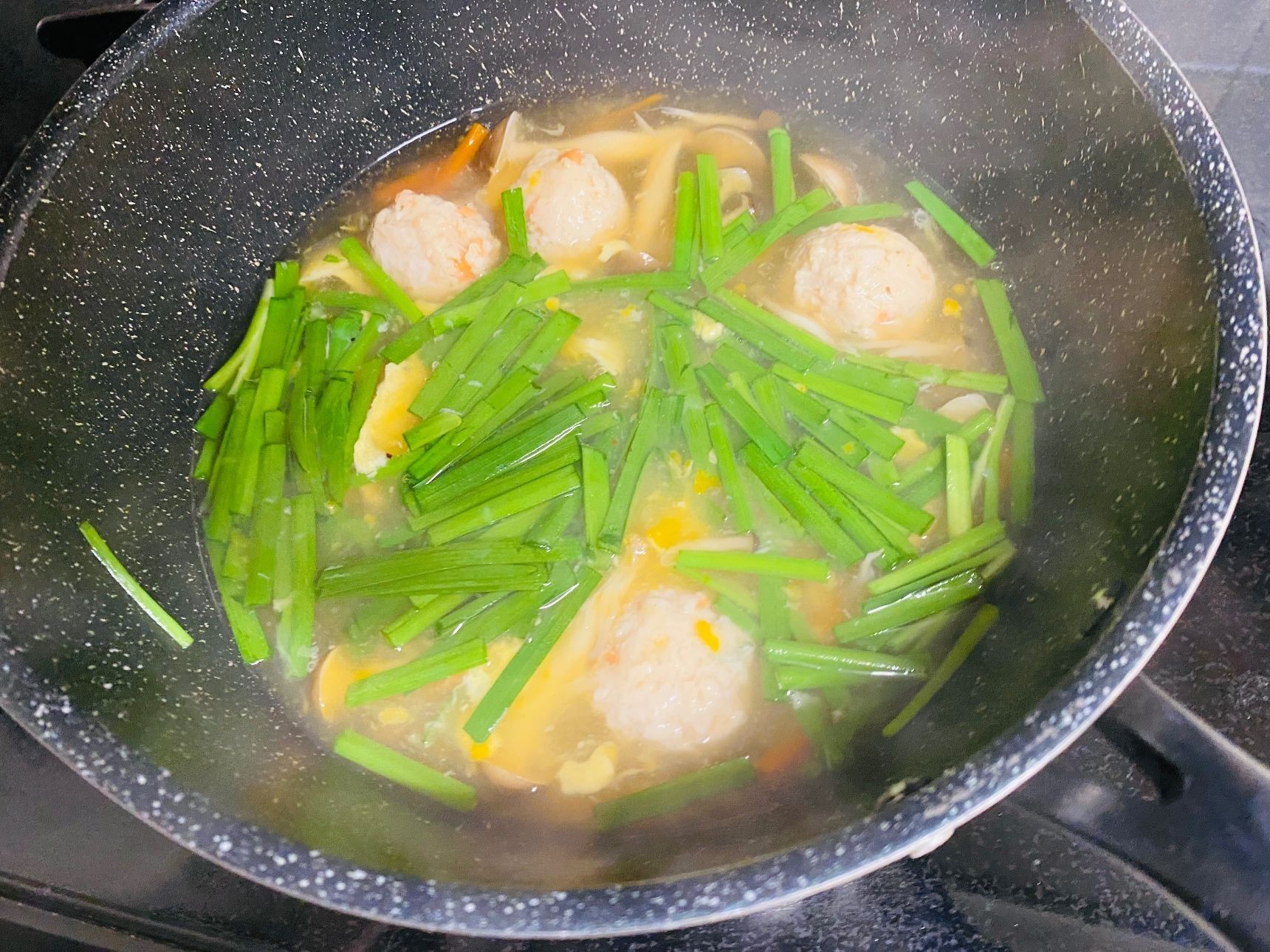 鍋に、出汁を入れ、しめじ、短冊切りにした人参を入れ火にかけます。
