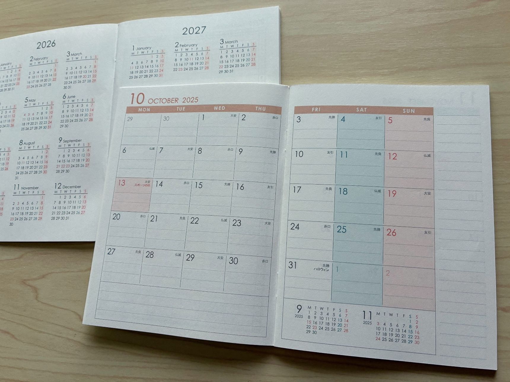 月曜始まりで、年間一覧、年間スケジュール、マンスリー、メモのページがあるオーソドックスタイプです。