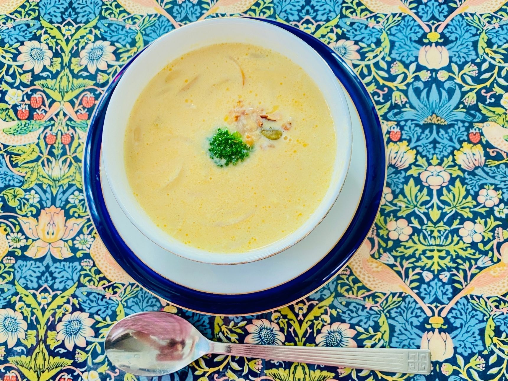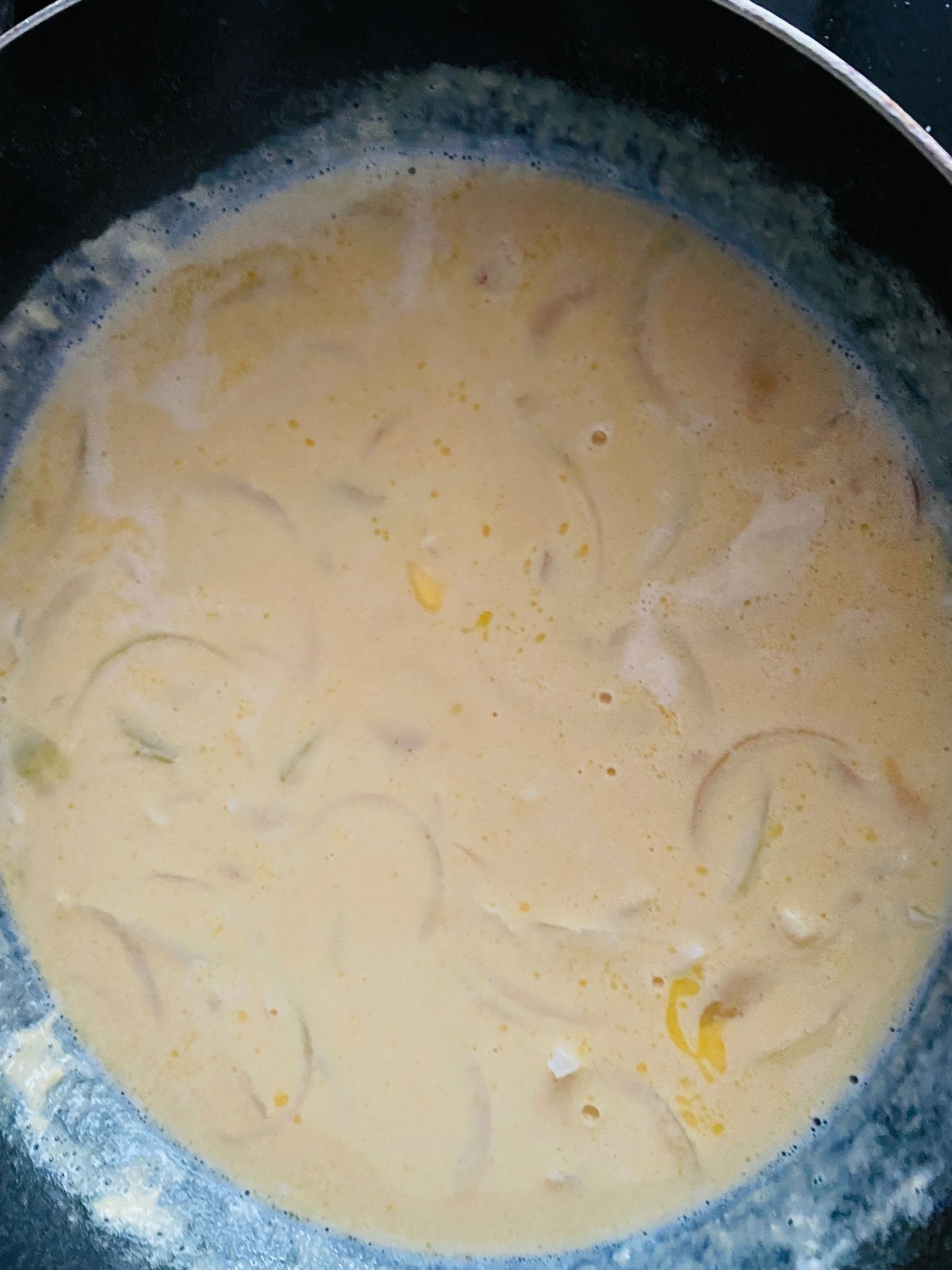 牛乳、コンソメ、コーンクリームの順に入れてよく混ぜます。塩胡椒で味を調えます。