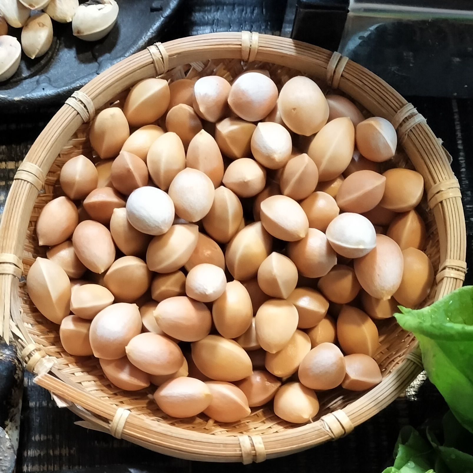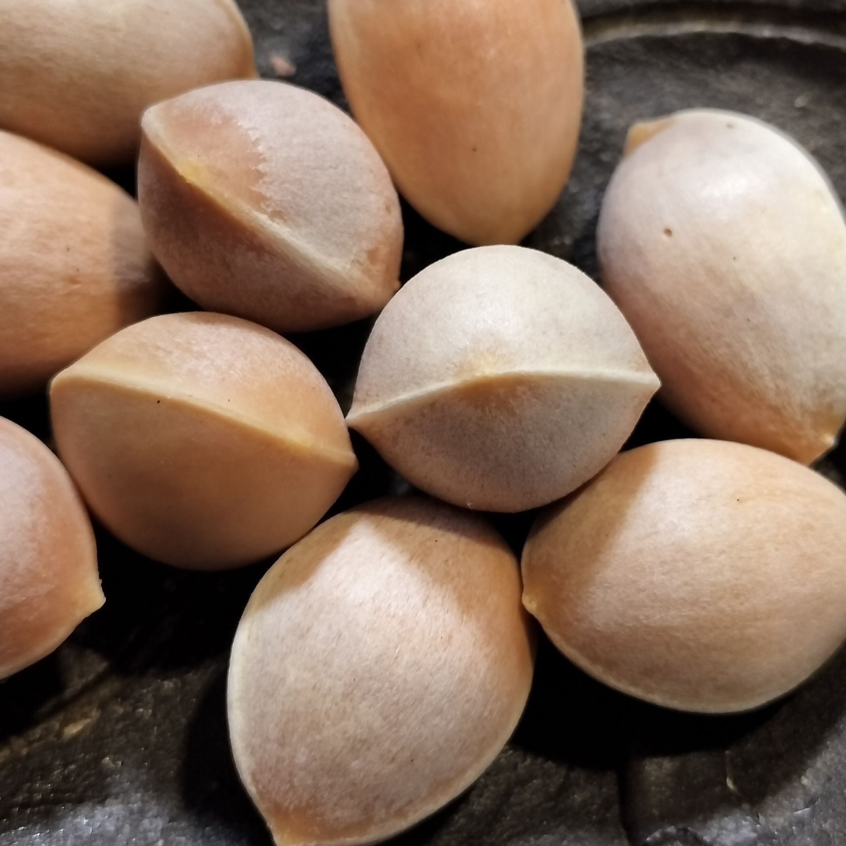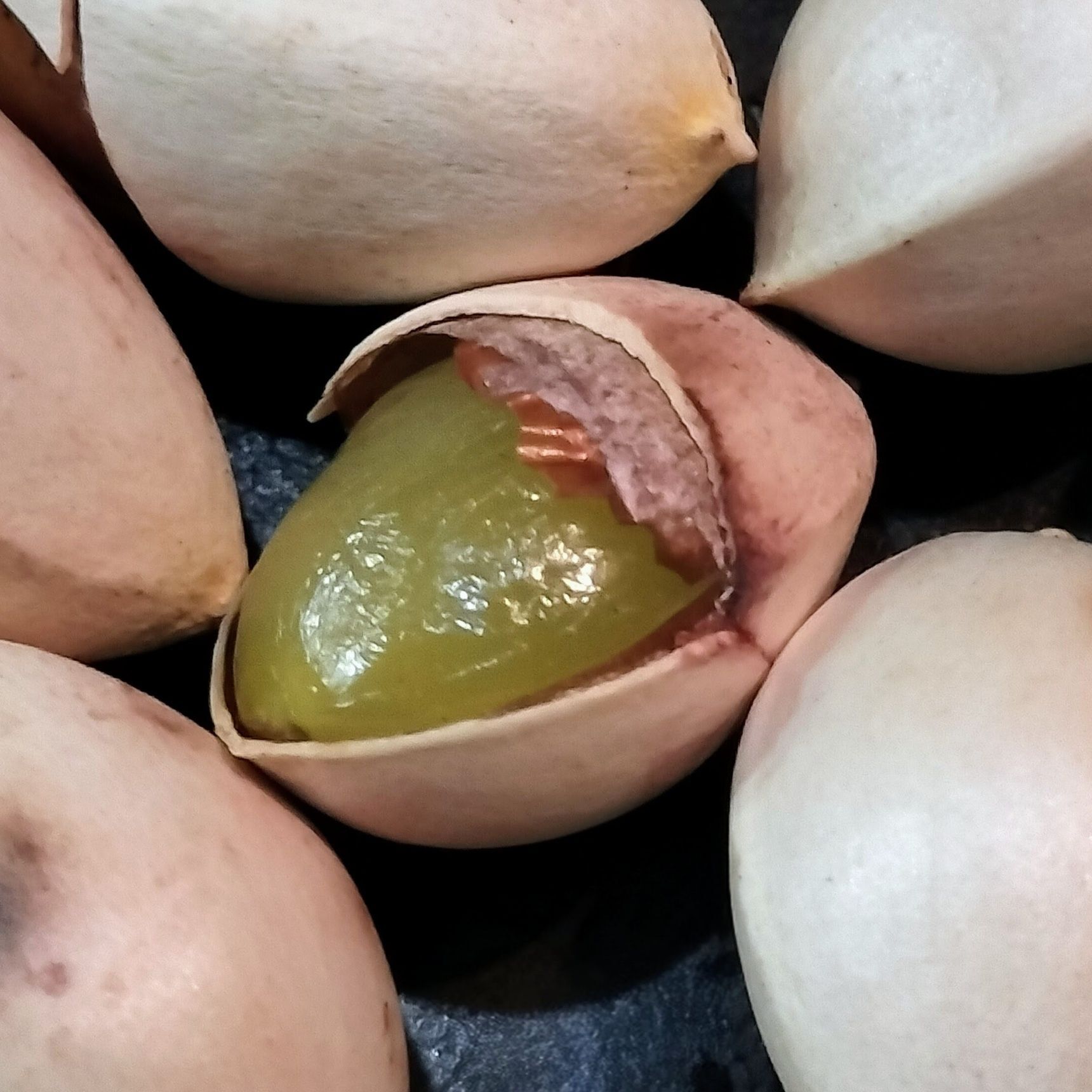 ※殻を割り、茶色い薄皮を剥いて、胚乳部分が透明な緑色(翡翠色)になったら完成!