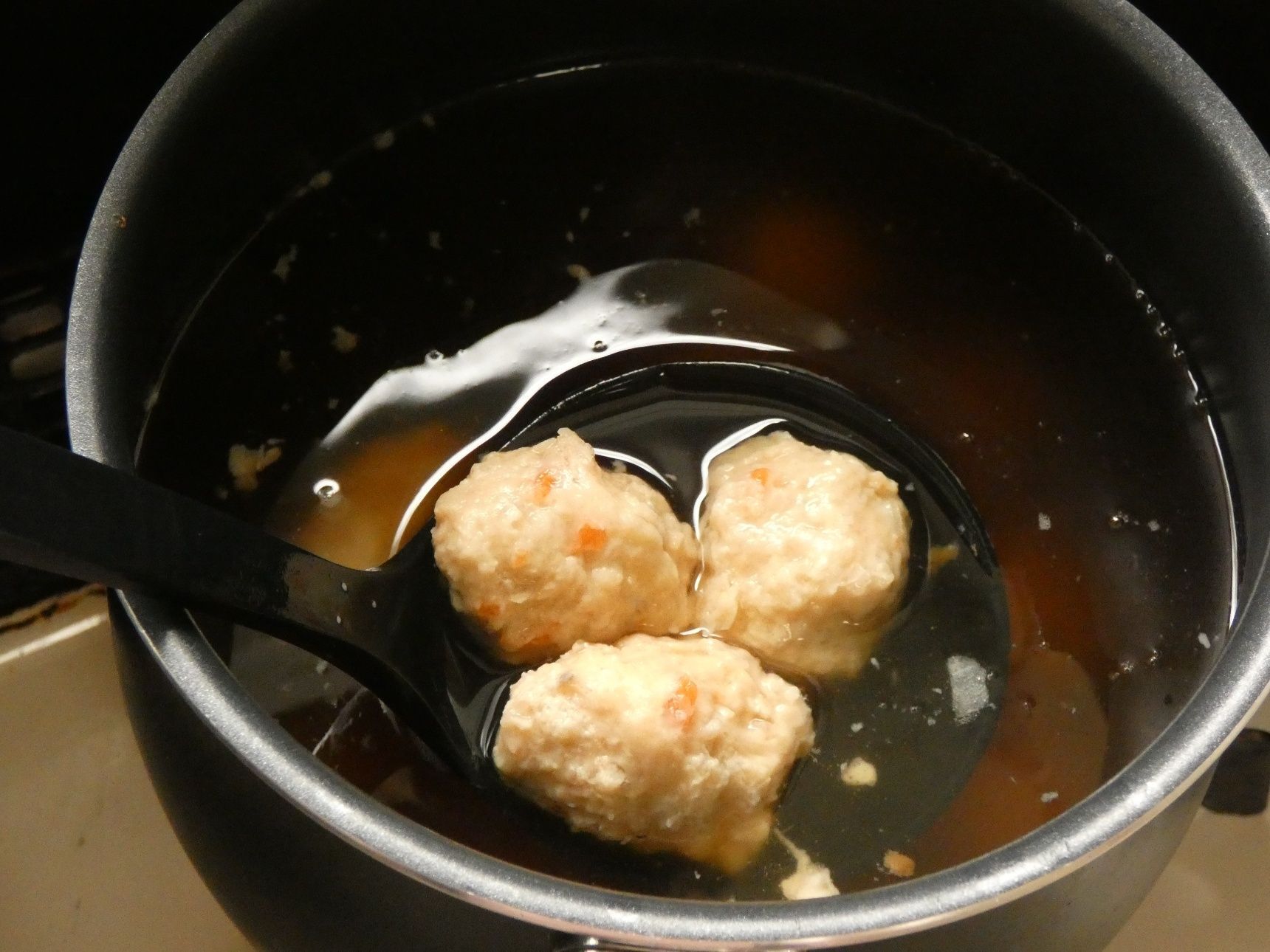 鍋に肉団子と水、酒、鶏がらスープの素、醤油を入れます。