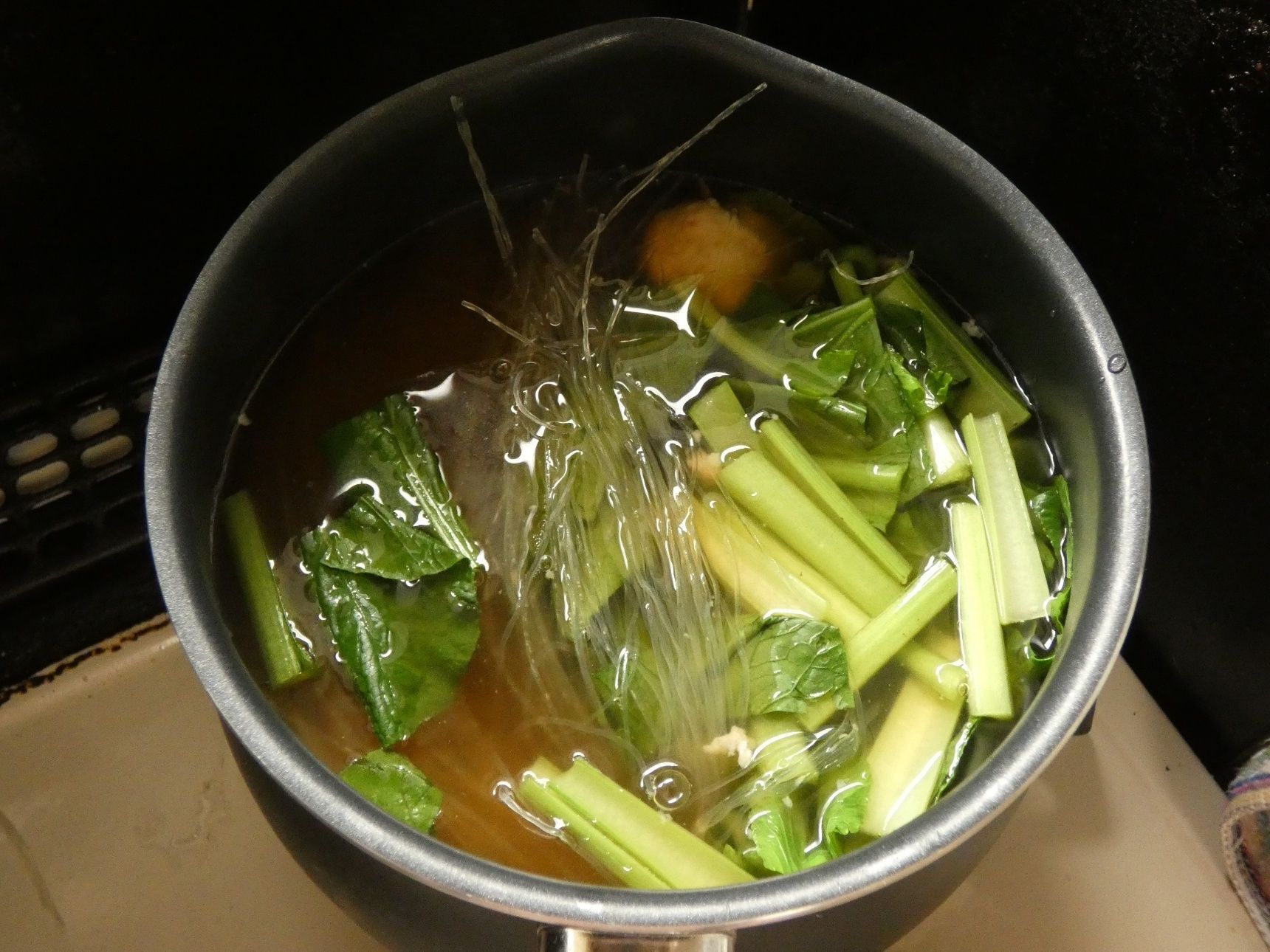 小松菜に火が通り、春雨が柔らかくなったら塩コショウで味付けして完成。