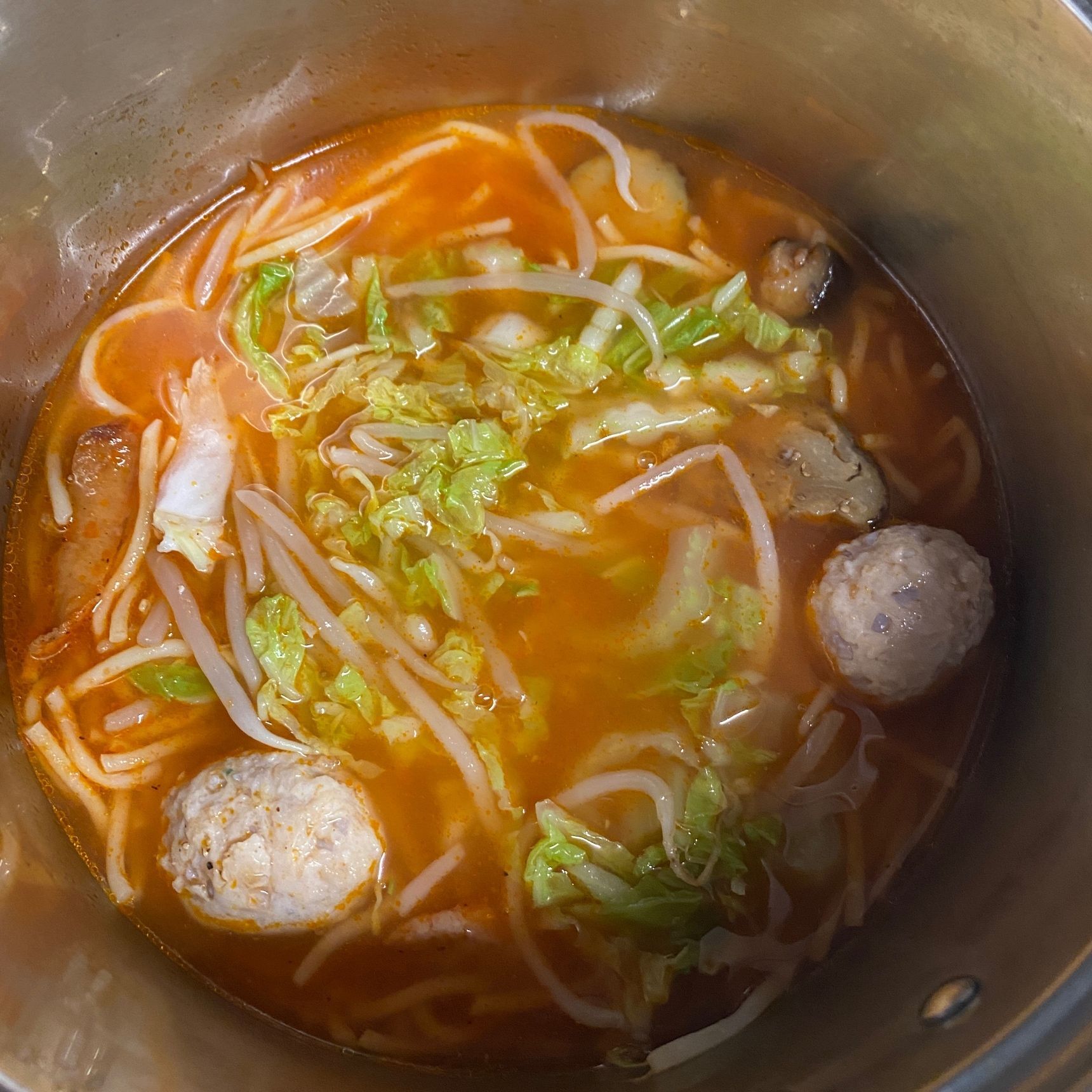 もやし、輪切りにした茄子、鶏団子ミンチ、手で細かく折ったパスタを入れ混ぜながら火にかけます。