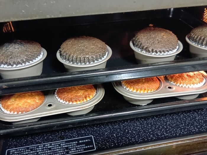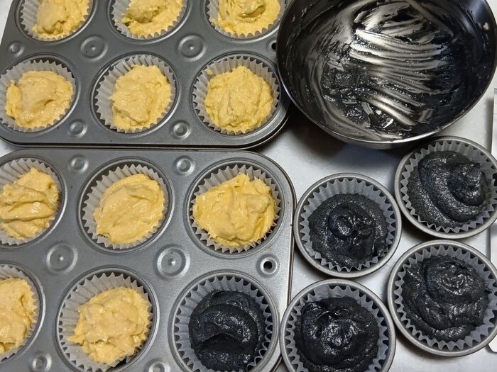 4:グラシン紙に生地を入れ、カップケーキ型16個に分け入れます。
