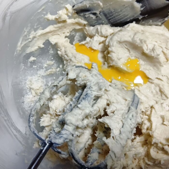 1:ボウルに室温に戻したバターを入れて、ハンドミキサーで混ぜ、てんさい糖を数回に分けて入れ、混ぜ合わせます。