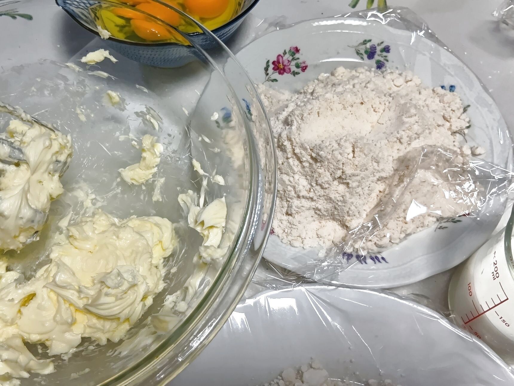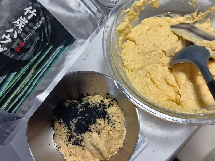 3:薄力粉とベーキングパウダーをふるい入れ、牛乳を加えてゴムべらで混ぜます。生地の一部(300g)を小さめのボウルに取り分け、竹炭パウダー1gを加えてよく混ぜ合わせます。