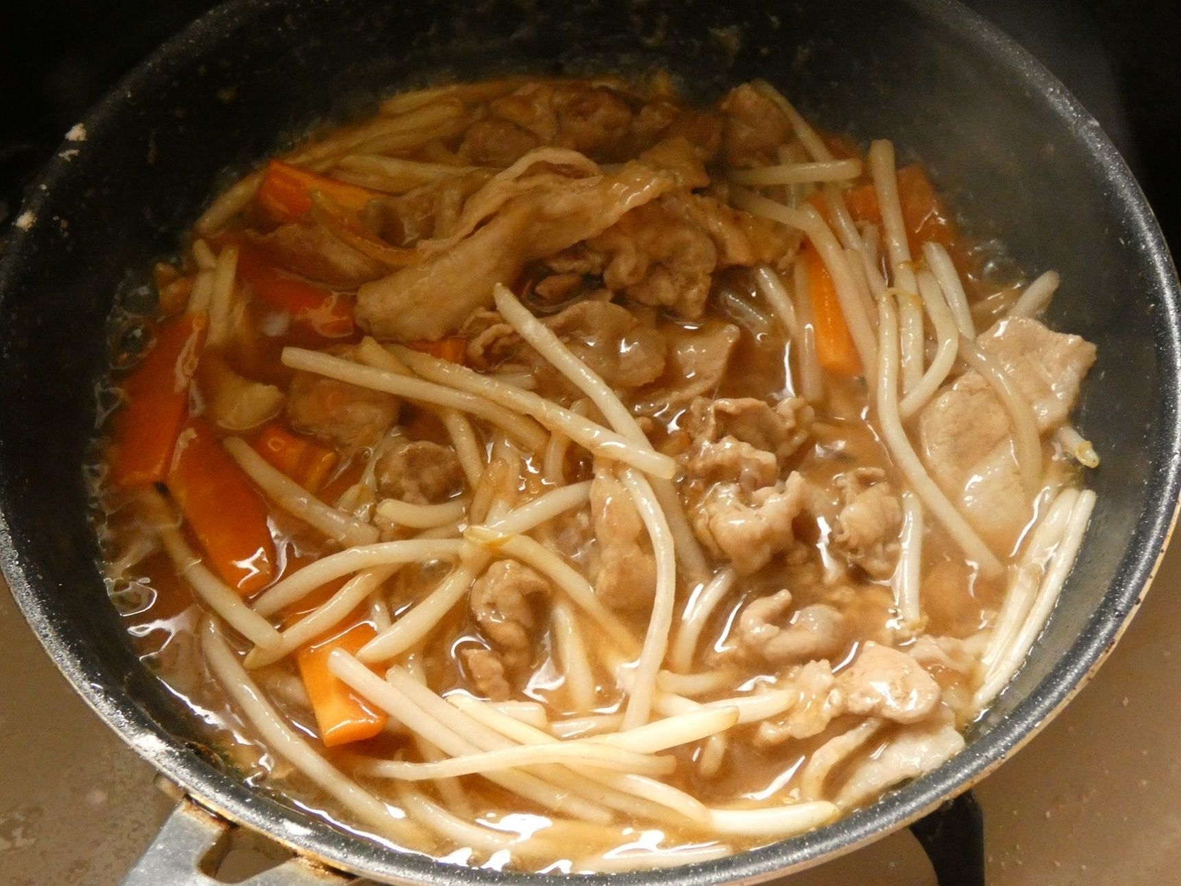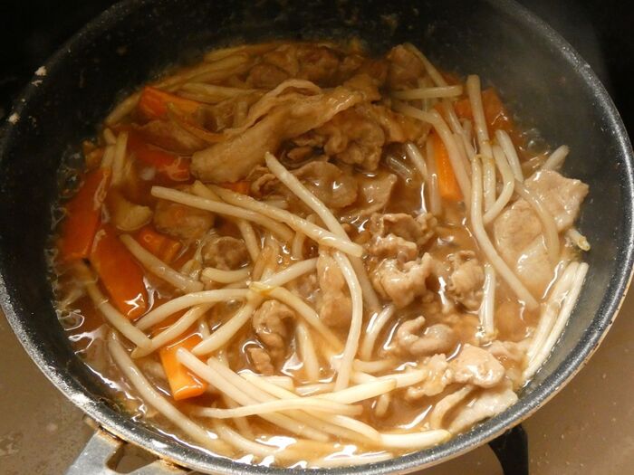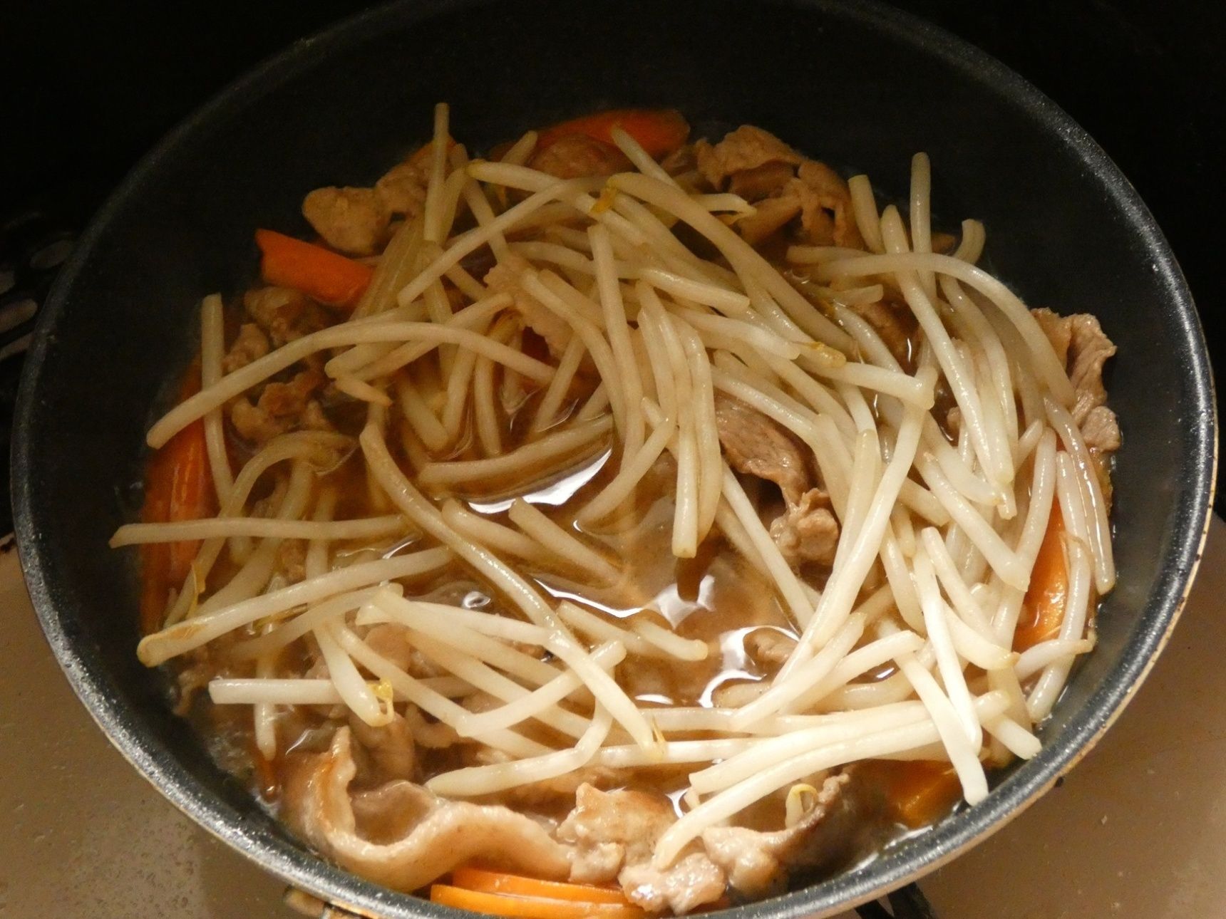 人参に火が通ったらもやしを入れてさっと炒め、Aを入れます。