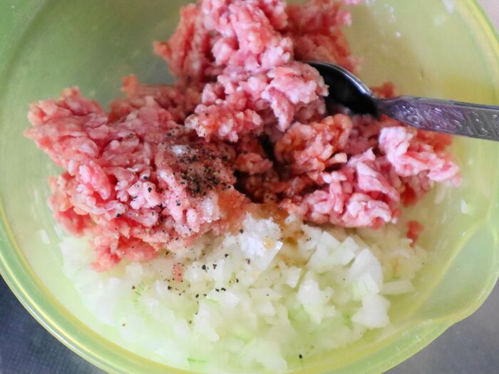 豚ひき肉、しょうが汁、ごま油、砂糖、塩、醤油、こしょうを加えて粘りが出るまでよく練りましょう。