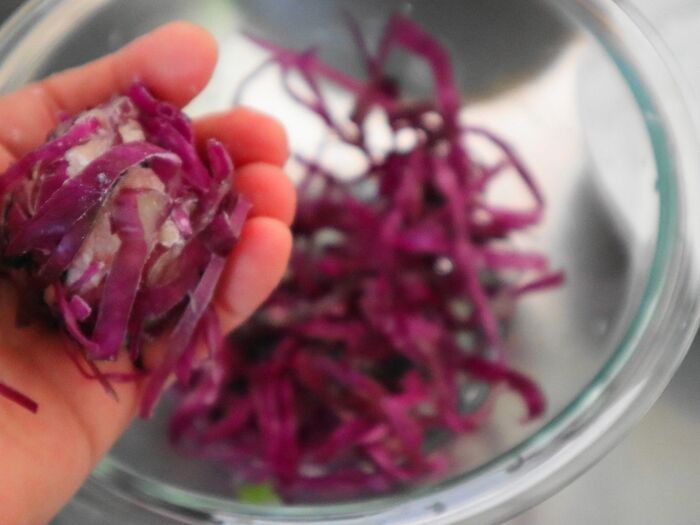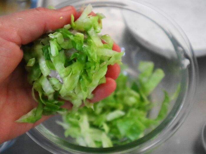 あとはぎゅっぎゅっと押さえつけるようにしてキャベツを全体に包みましょう。