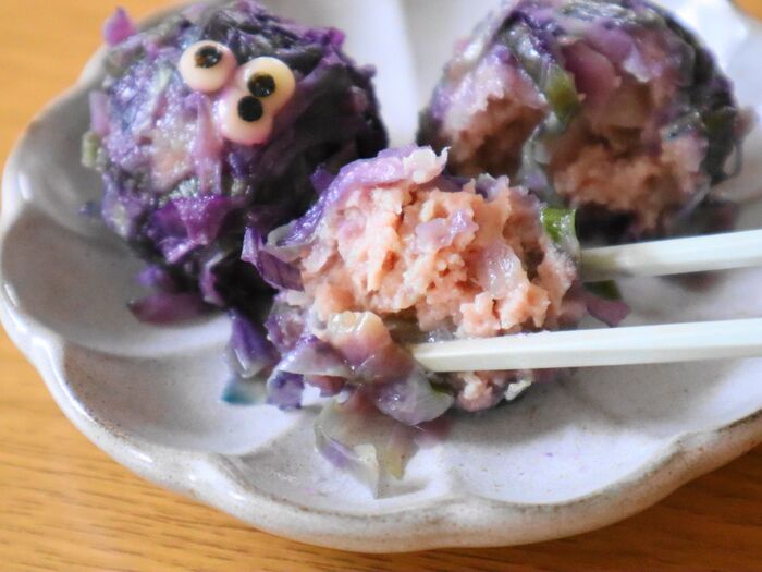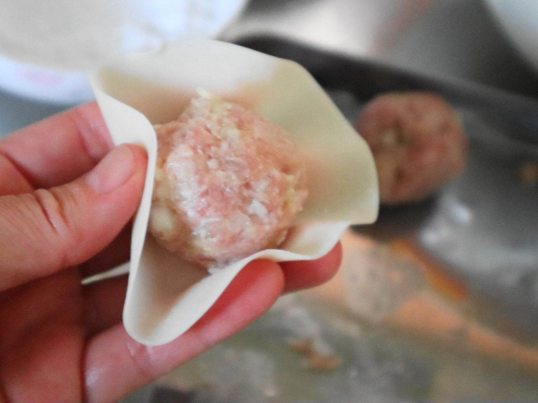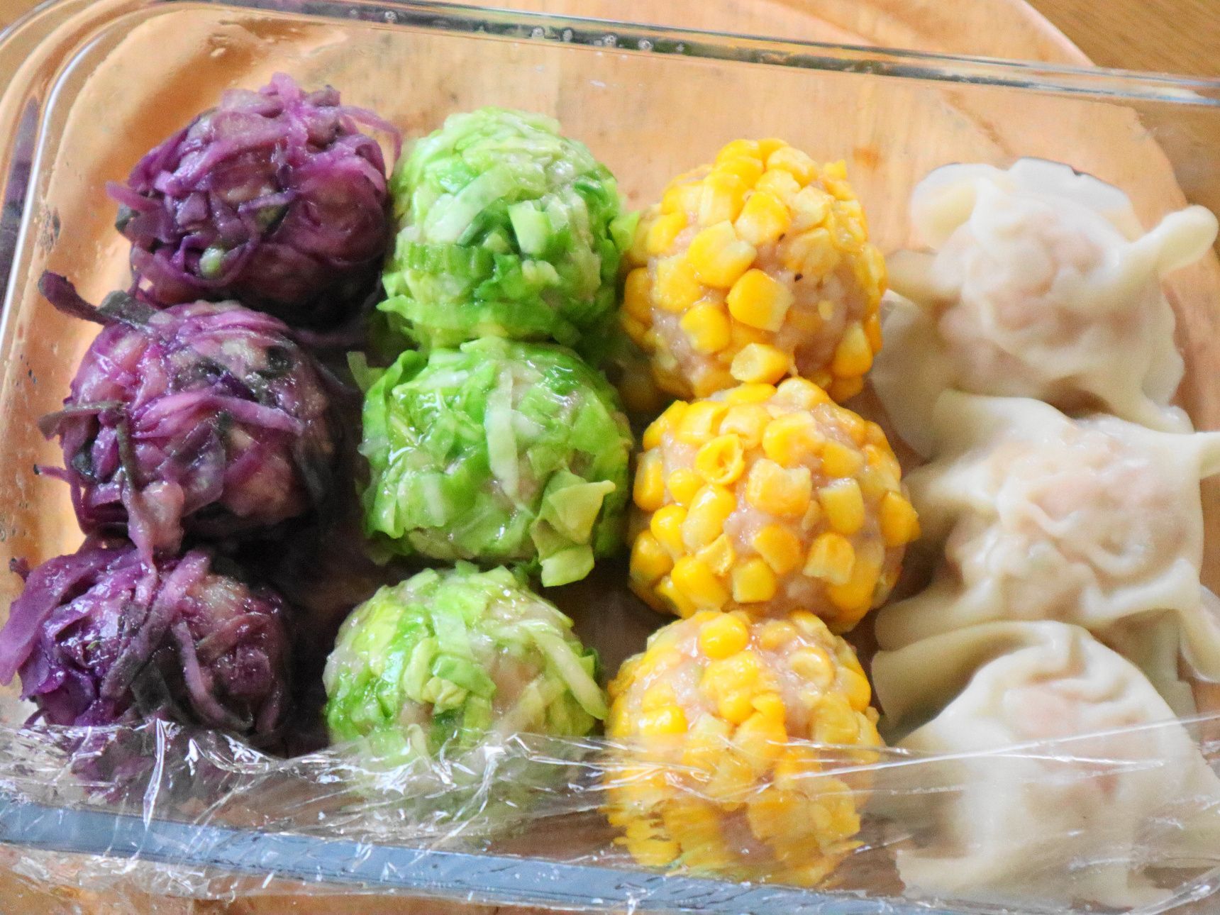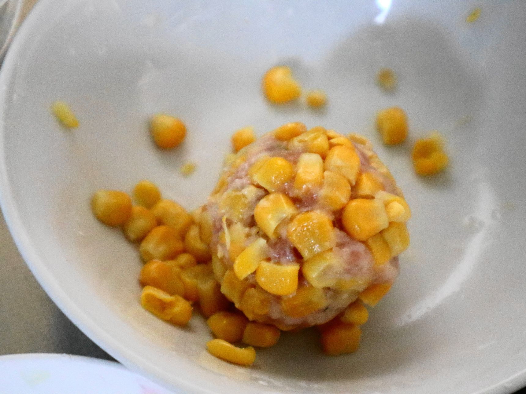 コーン、餃子の皮、キャベツ2色で肉ダネを包んでいきます。それぞれの食材がくっつくように片栗粉をまぶしてから包みます。