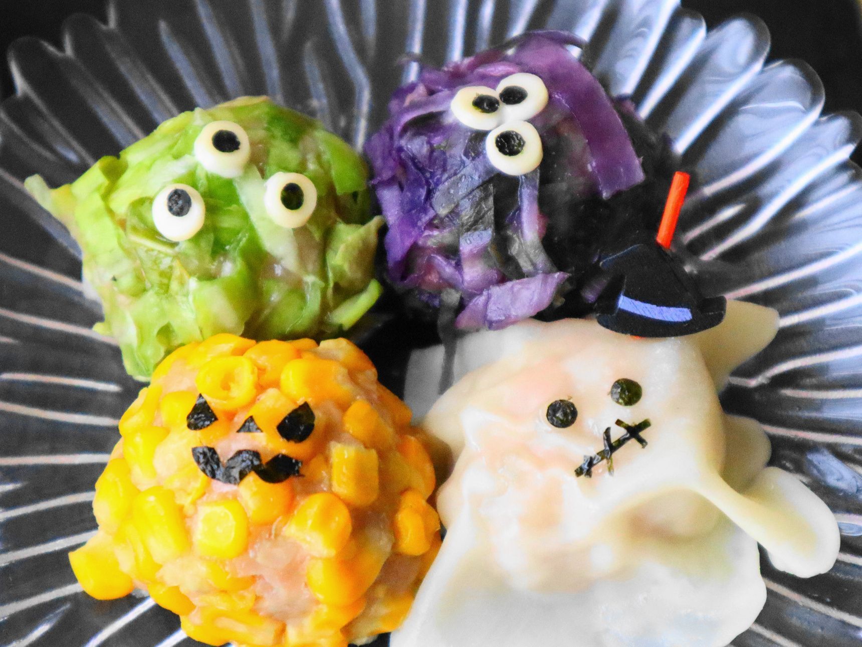 時間がないといはハロウィンカラーの4色のまま並べても雰囲気は出るので大丈夫ですが、よりハロウィンらしさを演出するならモンスターの顔を作ってみて。スライスチーズや海苔で目や口を作って焼売に貼っていきます。