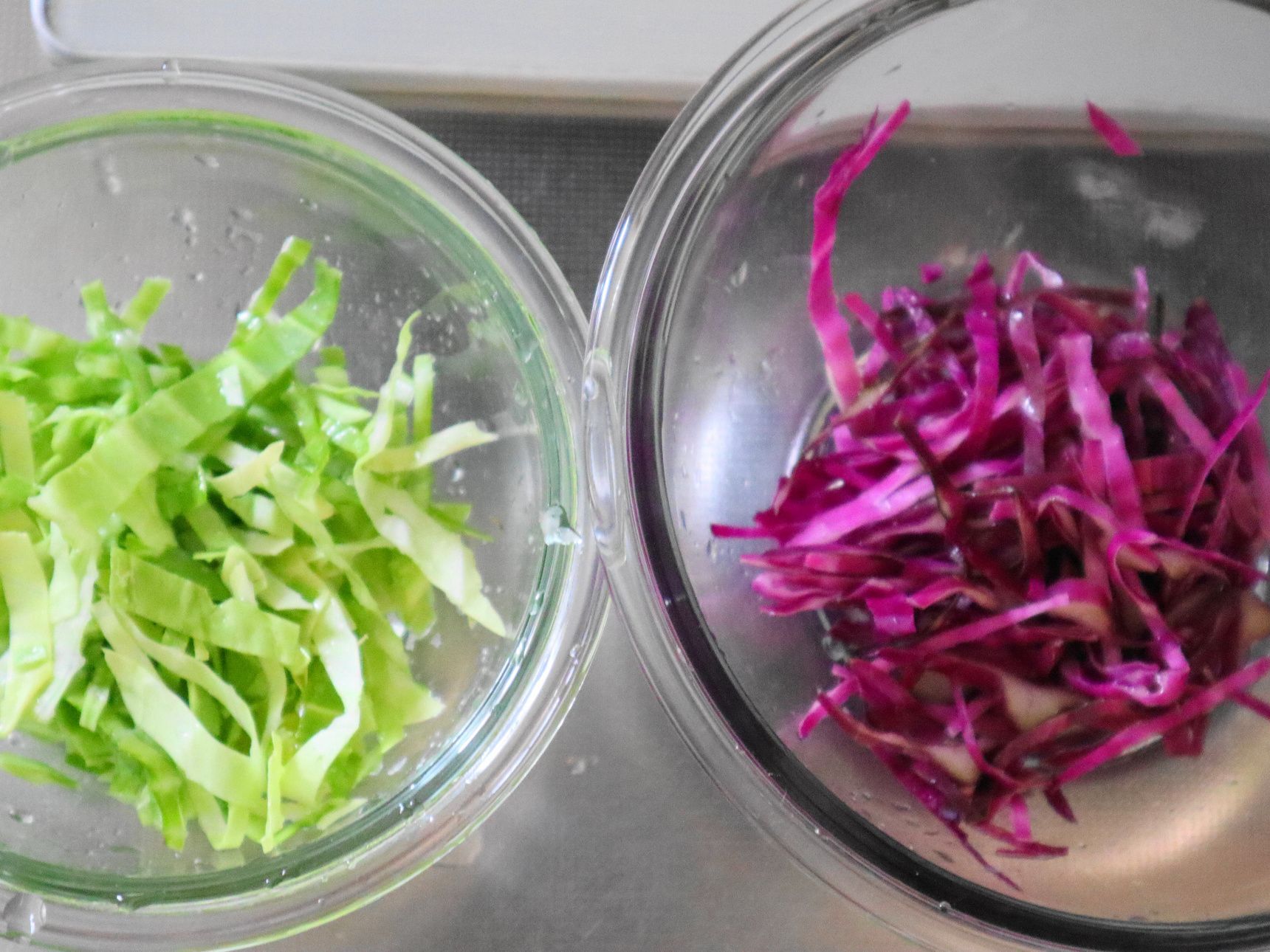 キャベツはふとめの千切りにしてから塩(分量外)をふってしばらく置き、水分が出てきたらしっかり絞って水を切ります。