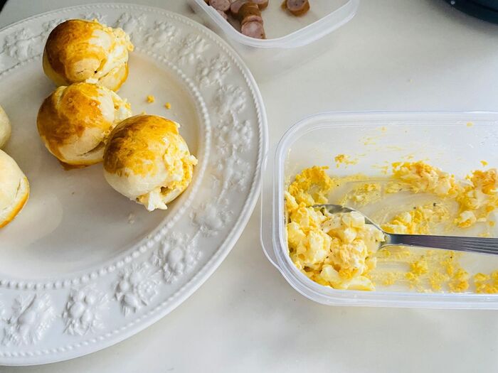 ゆで卵を潰してタルタルソースを作ります。