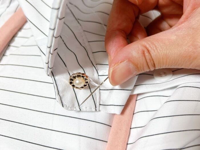 縫い付けるときにボタンの足とボタンホールが平行になるようにつけると、ボタンホールに負担がかかりにくくなります。