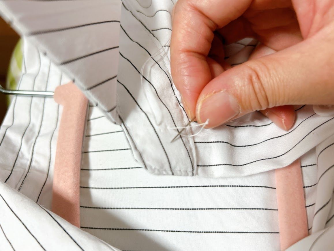 生地をすくうときは広くなりすぎると生地がひきつってしまうので、元のボタンが縫われていた針穴からはみ出ないようにつけるのがコツ。