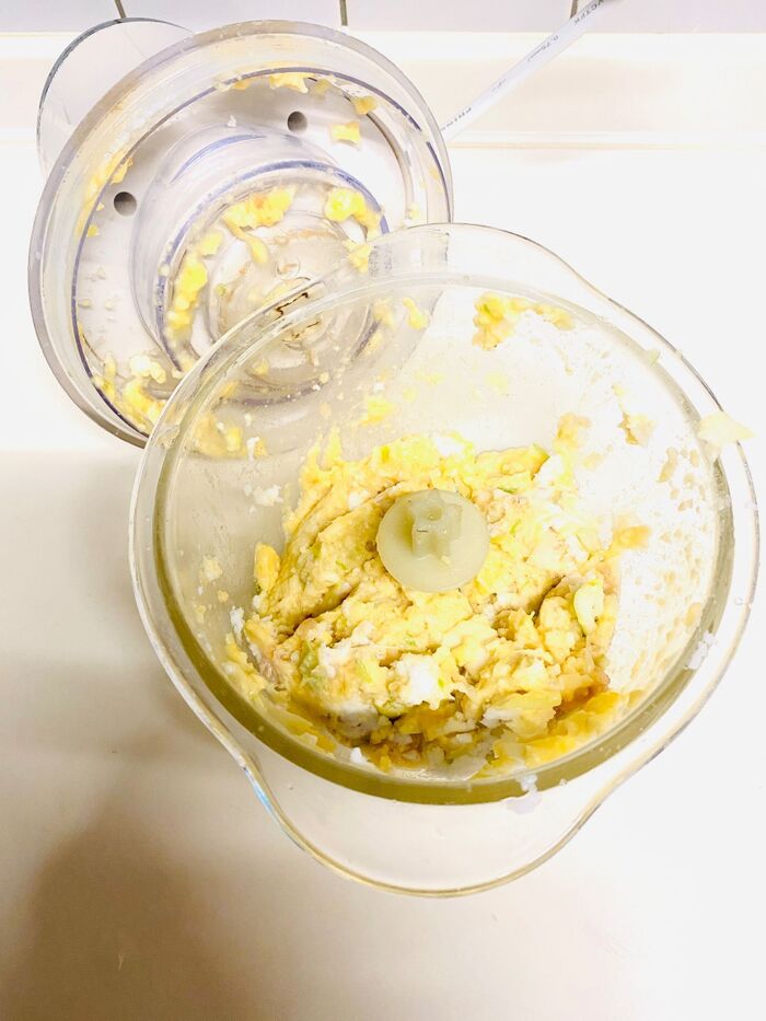②フードカッターに、手でちぎったはんぺん、①の絹豆腐、卵、ザクザクに切ったねぎ、豚ひき肉、生姜を入れ細くします。