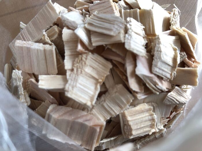 詰めている間もヒノキが薫ってきます。チップの間に隙間があるので、隙間をたまに埋めながら詰めました。