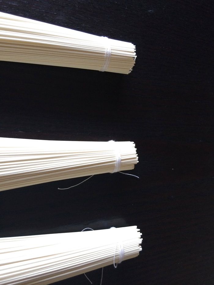 ⑤茹でたら流水で洗い、束の部分をもってねじって盛り付け、糸からの部分を切り落とす。