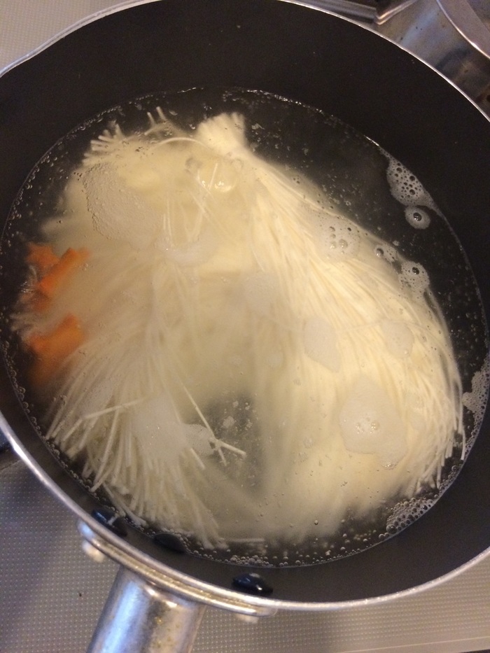 ③鍋に水と人参を入れ、沸騰してきたら素麺を入れ、