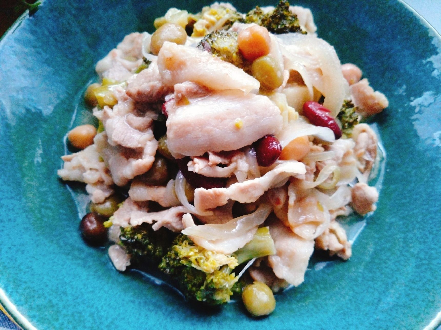 2.ブロッコリーを加えて鮮やかな緑色になるまで炒め、玉ねぎとミックスビーンズ、白ワイン、穀物酢を加えて混ぜて蓋をし、弱めの中火で20分煮込む。
