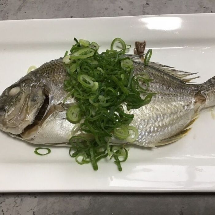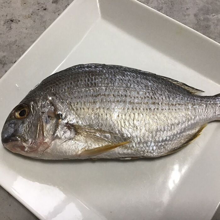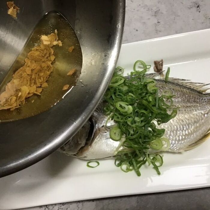 平鯛をフライパンに入れ、日本酒をかけひたひたの水を入れて加熱して