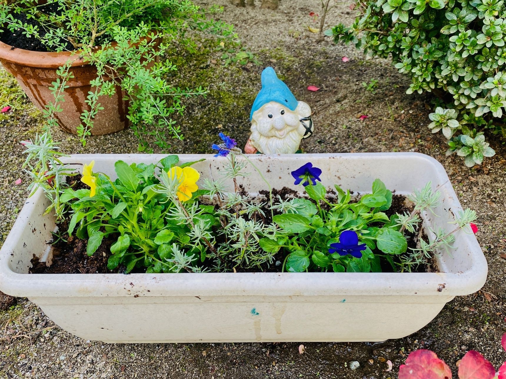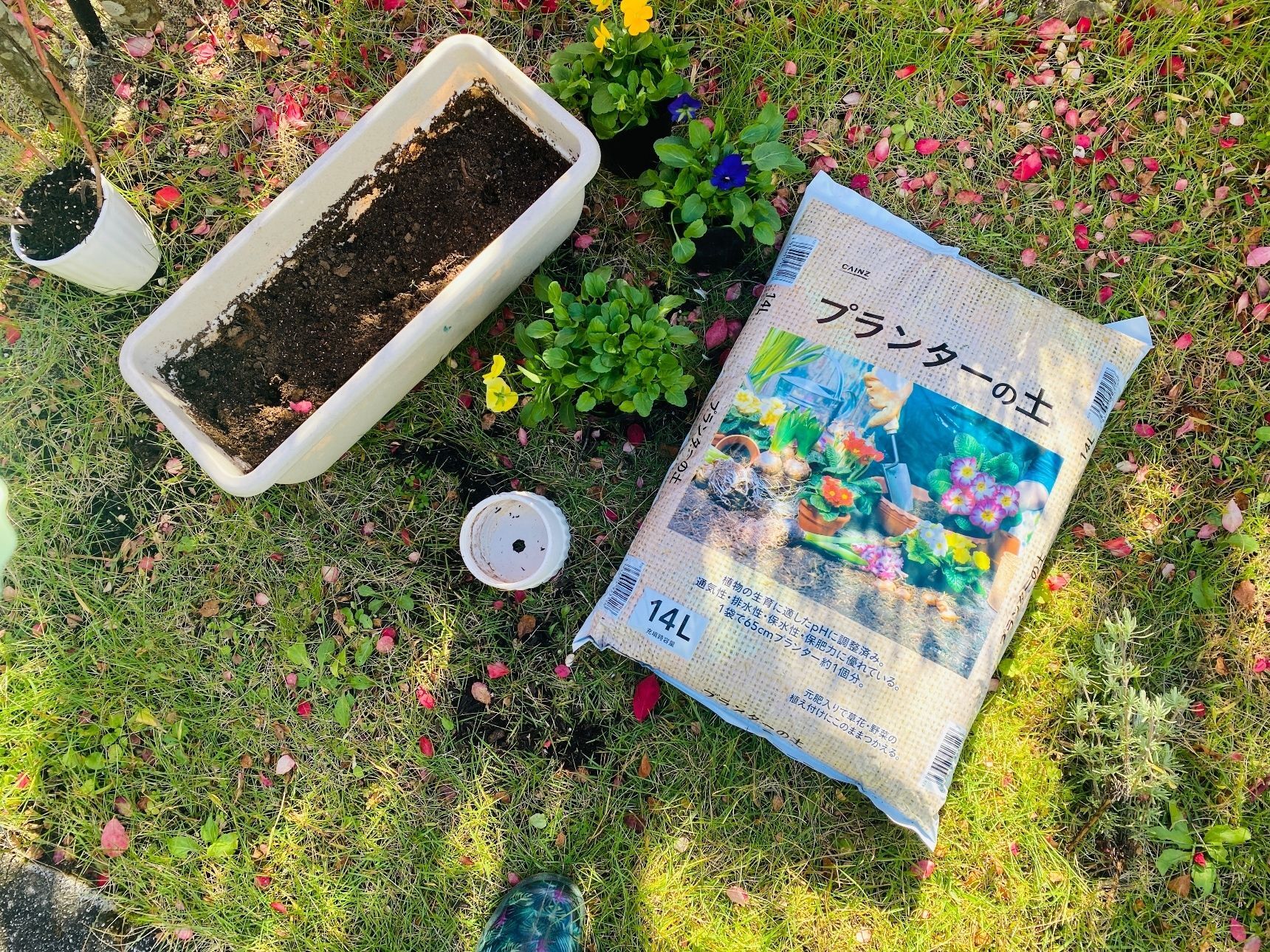 プランターの土は日光消毒してから、フラワーポットに入れました。