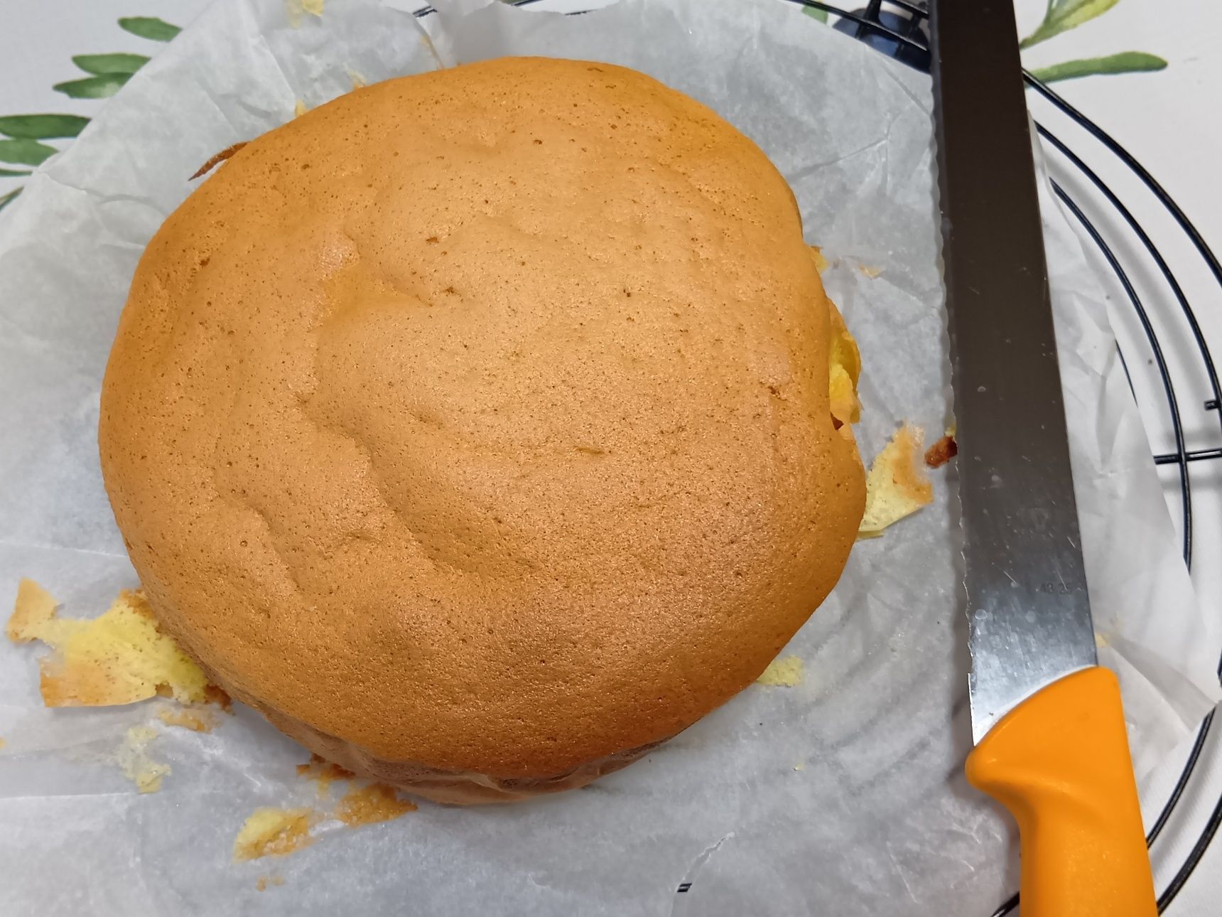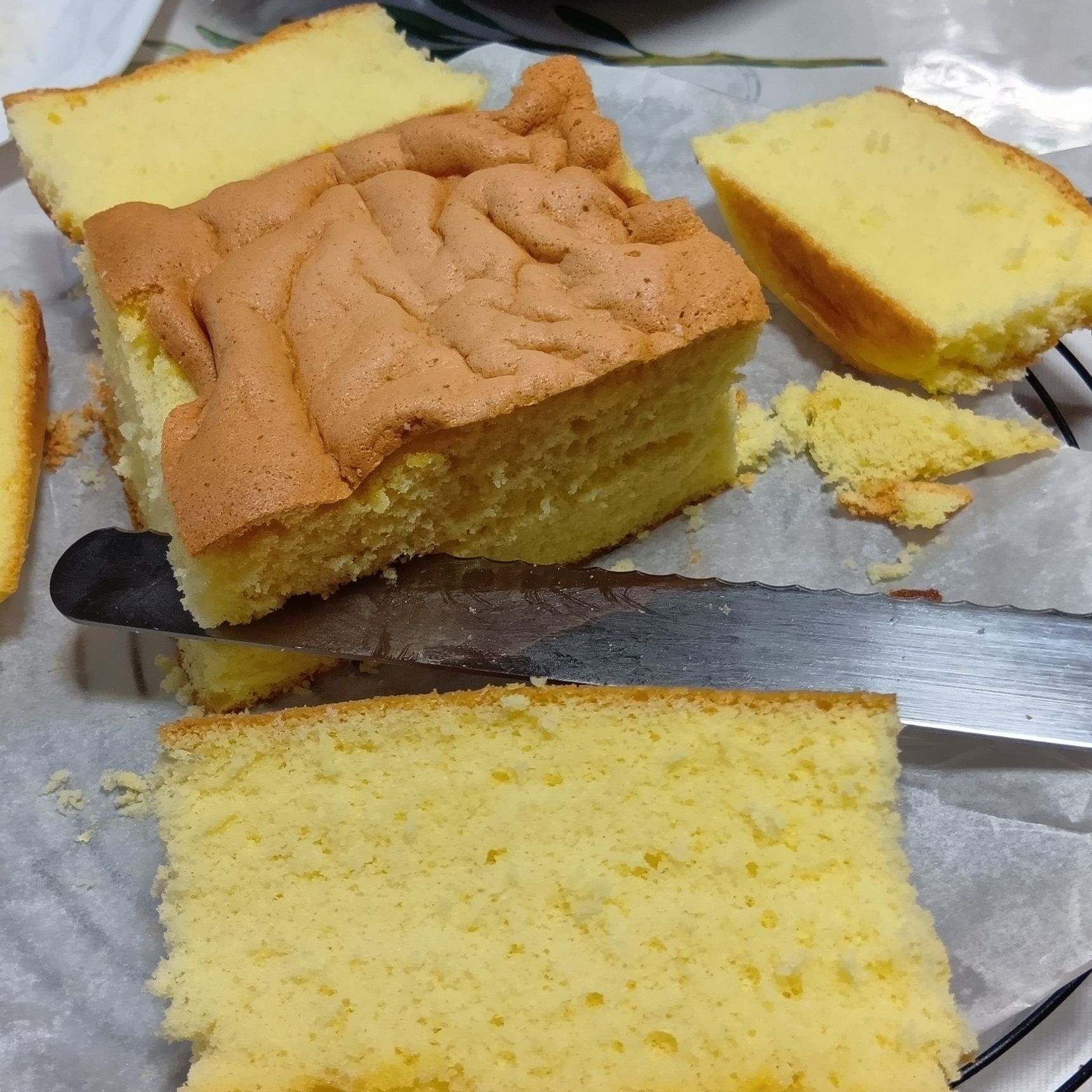 ①スポンジケーキの端を切り落とし、きれいな四角形に整えます。