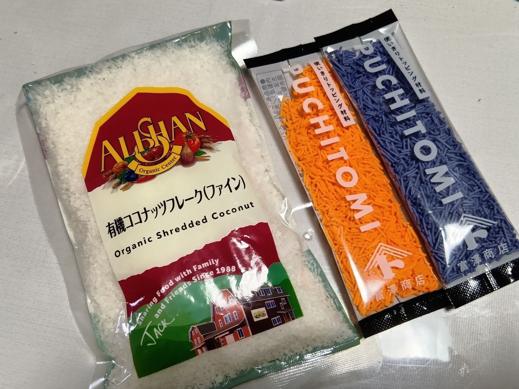 別の皿にココナッツフレーク(ファイン)をたっぷり入れ、平らにならしておきます。