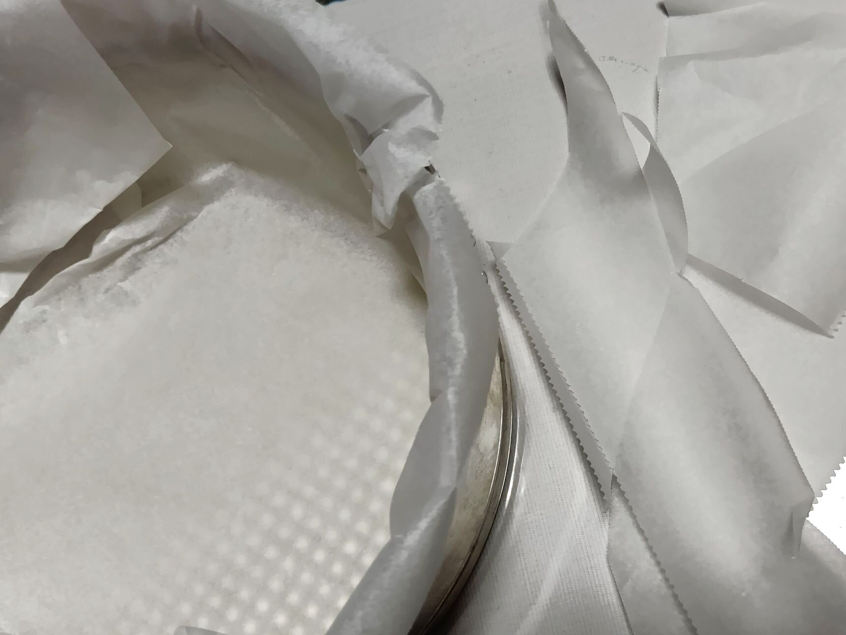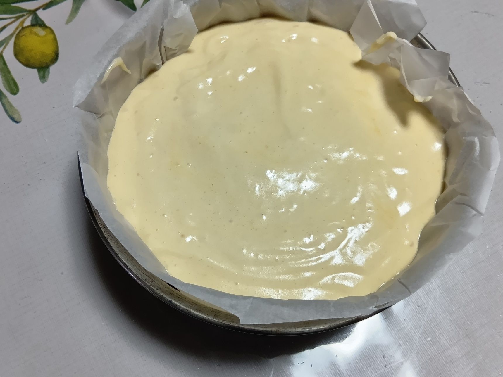クッキングシートを18cmのケーキ型にしっかり敷き込み、型からはみ出た余分な部分はハサミでカットします。