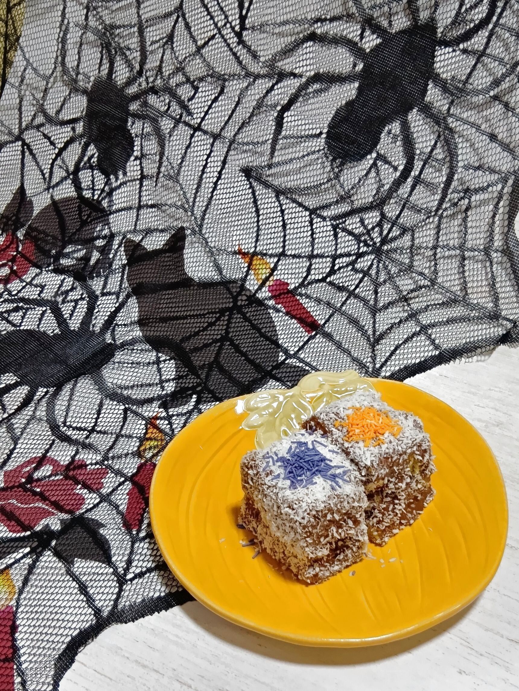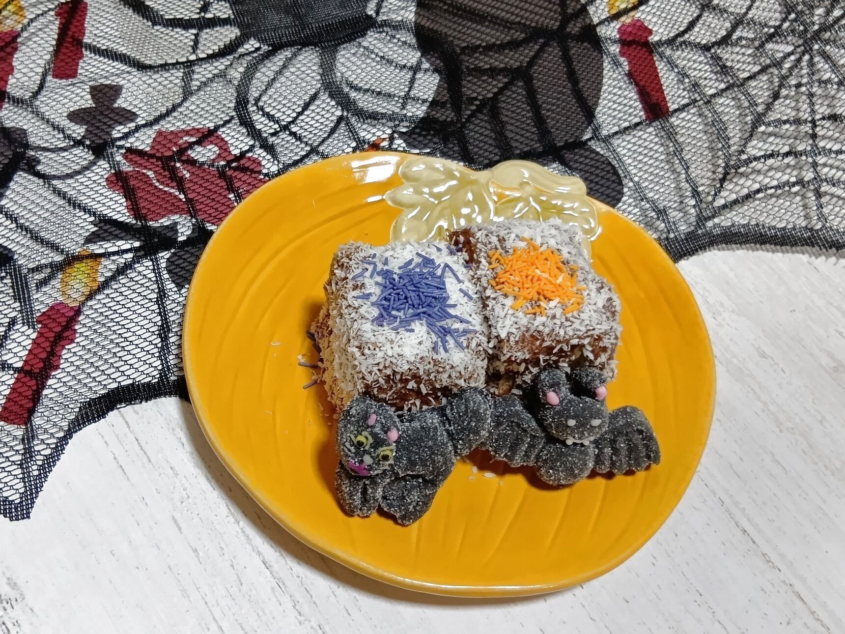 仕上げにハロウィンらしく、ケーキの上にオレンジと紫のシュガースプレーをトッピングします。オレンジ色のラミントン2個と、紫色のラミントン2個を作ります。