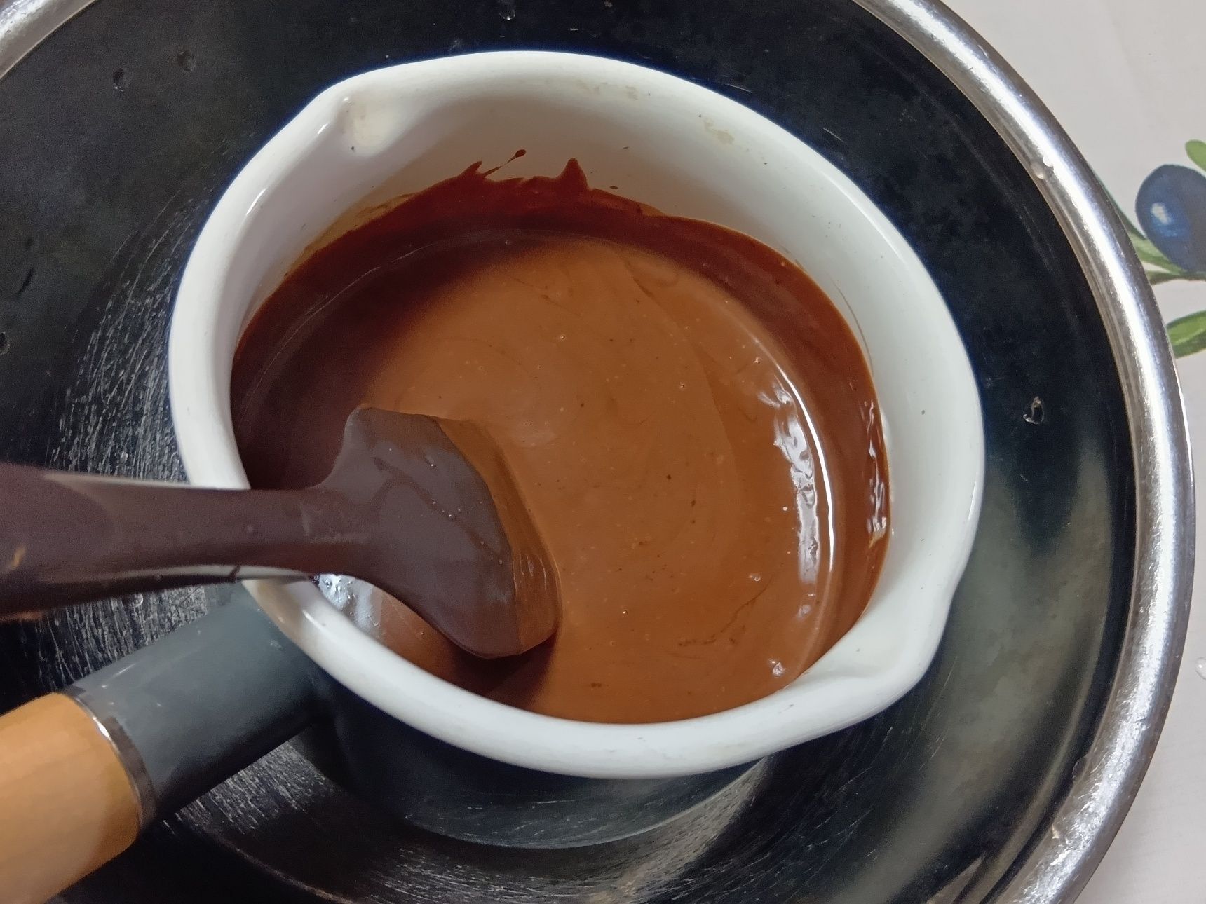④チョコレートは細かく刻み、ミルクパンで生クリームを沸騰直前まで温めたら火を止め、刻んだチョコを加えて1分ほど置きます。その後、ゴムベラでなめらかになるまで混ぜてガナッシュを作ります。(室温が低い場合は湯せんにあてる)