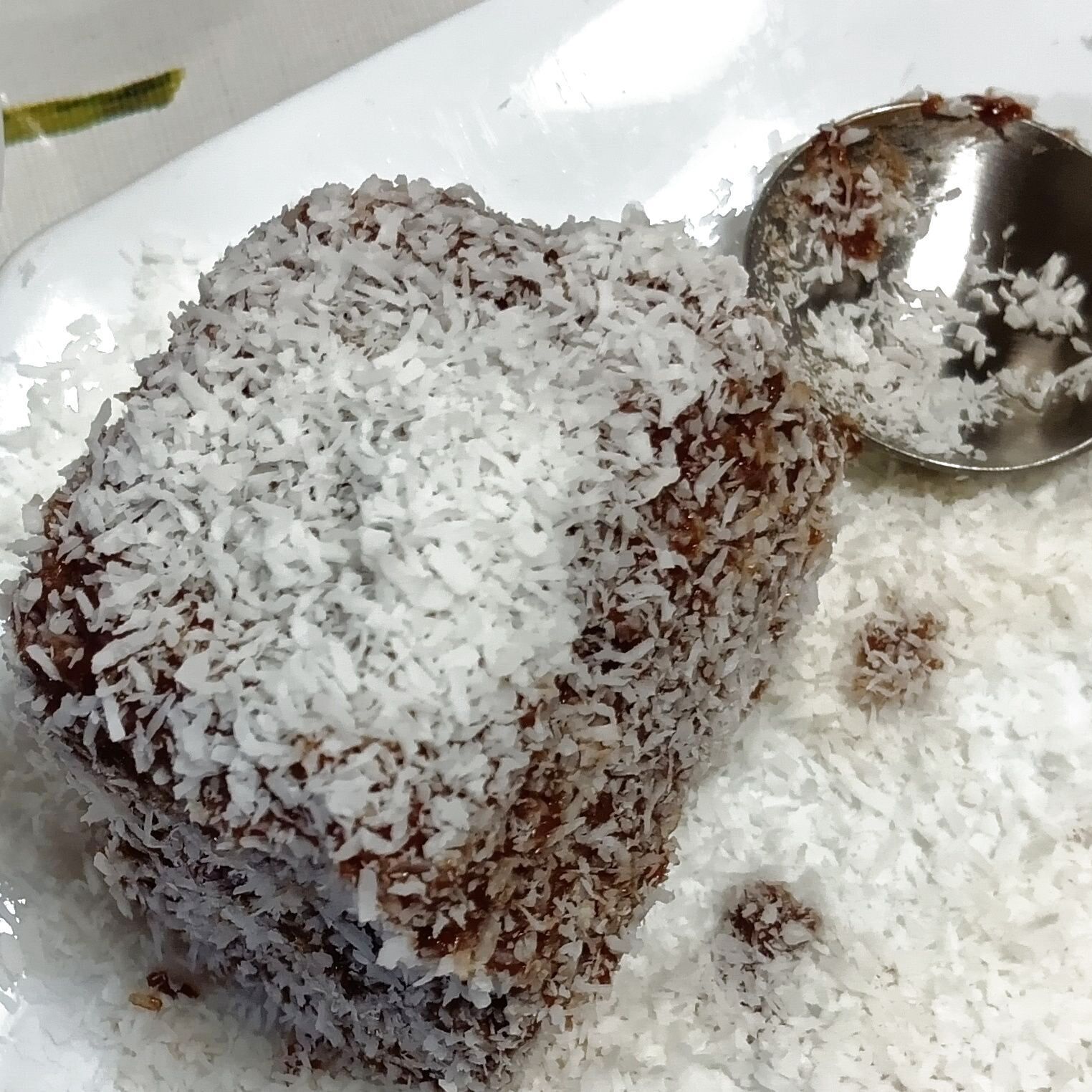 ⑤③のスポンジケーキに④のガナッシュを全体にかけ、その上からココナッツフレーク(ファイン)を転がすようにしてまぶします。