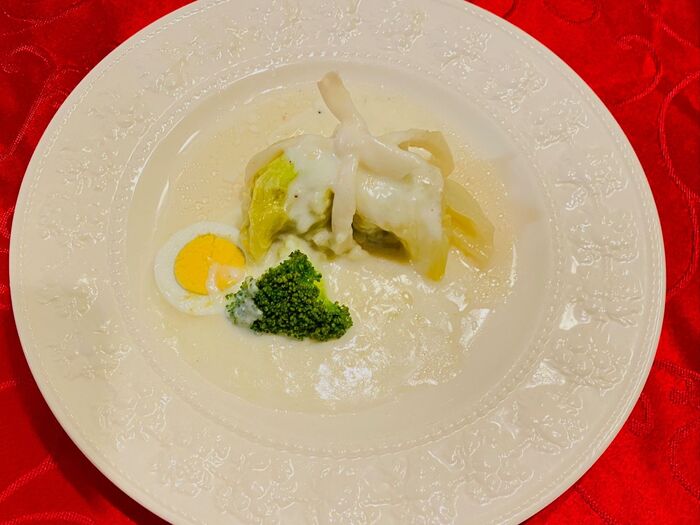 ⑥よく煮込んだロールキャベツを水気を切って器にのせ、⑤のホワイトソースをかけます。彩りに、冷蔵庫にあったゆで卵やブロッコリーを添えました。