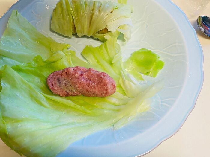 ③①のキャベツにのせて、しっかりと包みます。葉が小さい時は足して包みます。もう一回、キャベツを巻いて包みます。