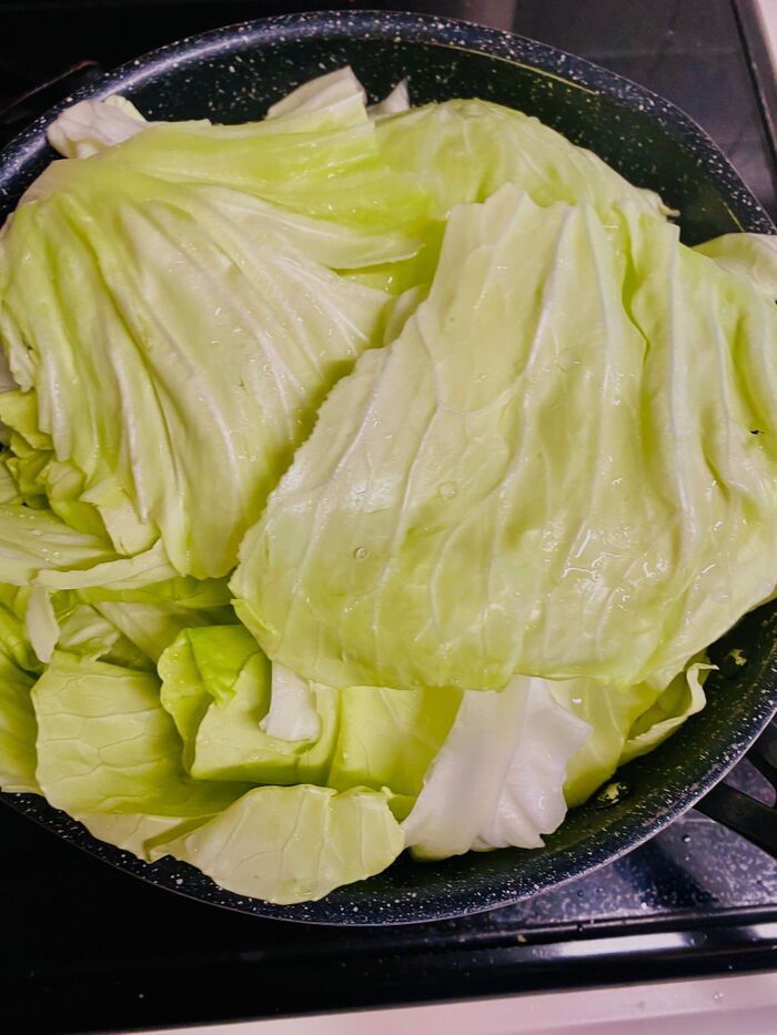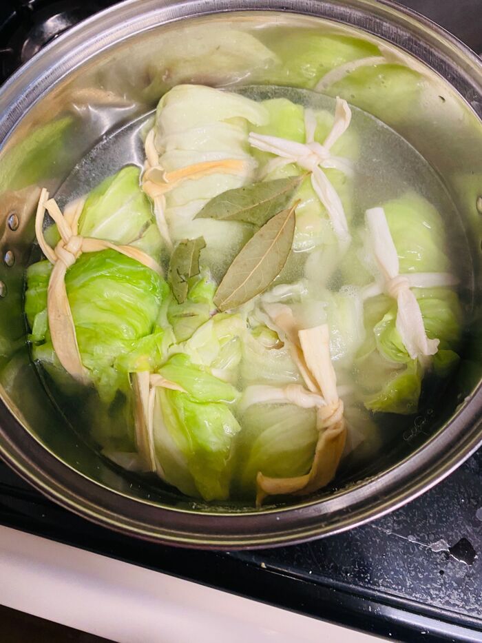 ①キャベツは硬い芯を取り除き、よく洗います。お湯を沸かし塩を入れ、巻きやすくなるようにやわらかく茹でます。よく水気を切っておきます。