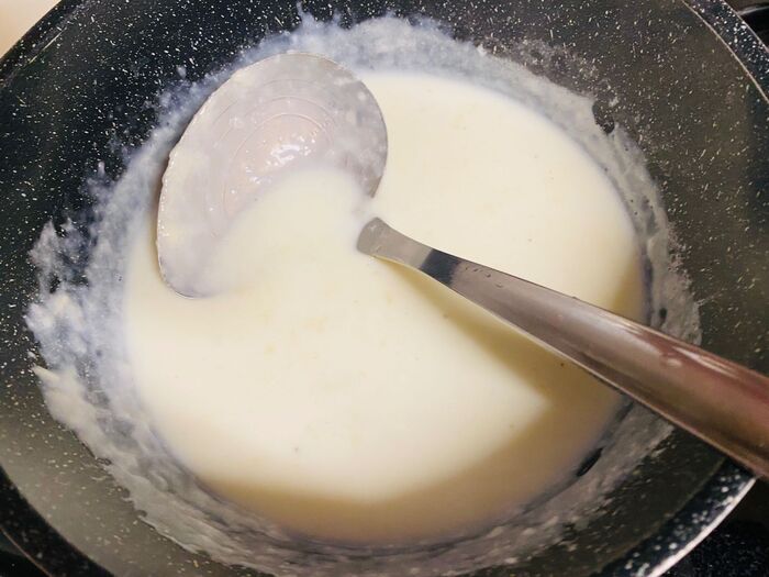 ⑤ホワイトソースを作ります。鍋を弱火で温め、バターを入れます。小麦粉を入れ溶かします。④のスープをお玉ですくって加え、伸ばします。そこに牛乳を少しずつ入れて伸ばしていきます。塩胡椒で味をととのえます。