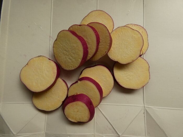 サツマイモは皮ごと1cmくらいの厚さの輪切りにします。ふんわりラップをし、電子レンジ600Wで3分半過熱します。