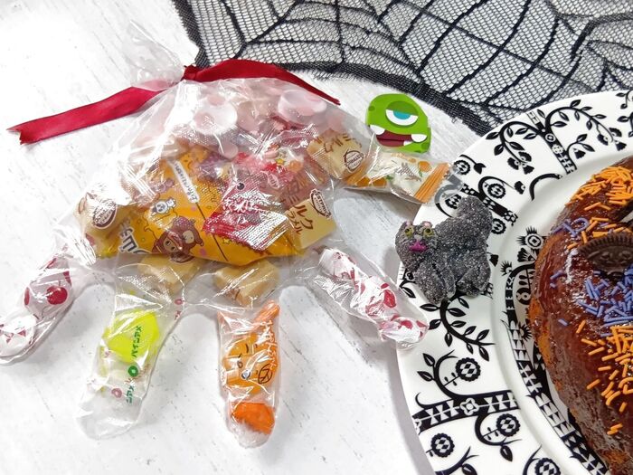 2.指先を入れたら、手の平部分に、ハロウィンパッケージのお好みのお菓子などを入れる。手首部分を、リボンなどで、結んだら完成です。