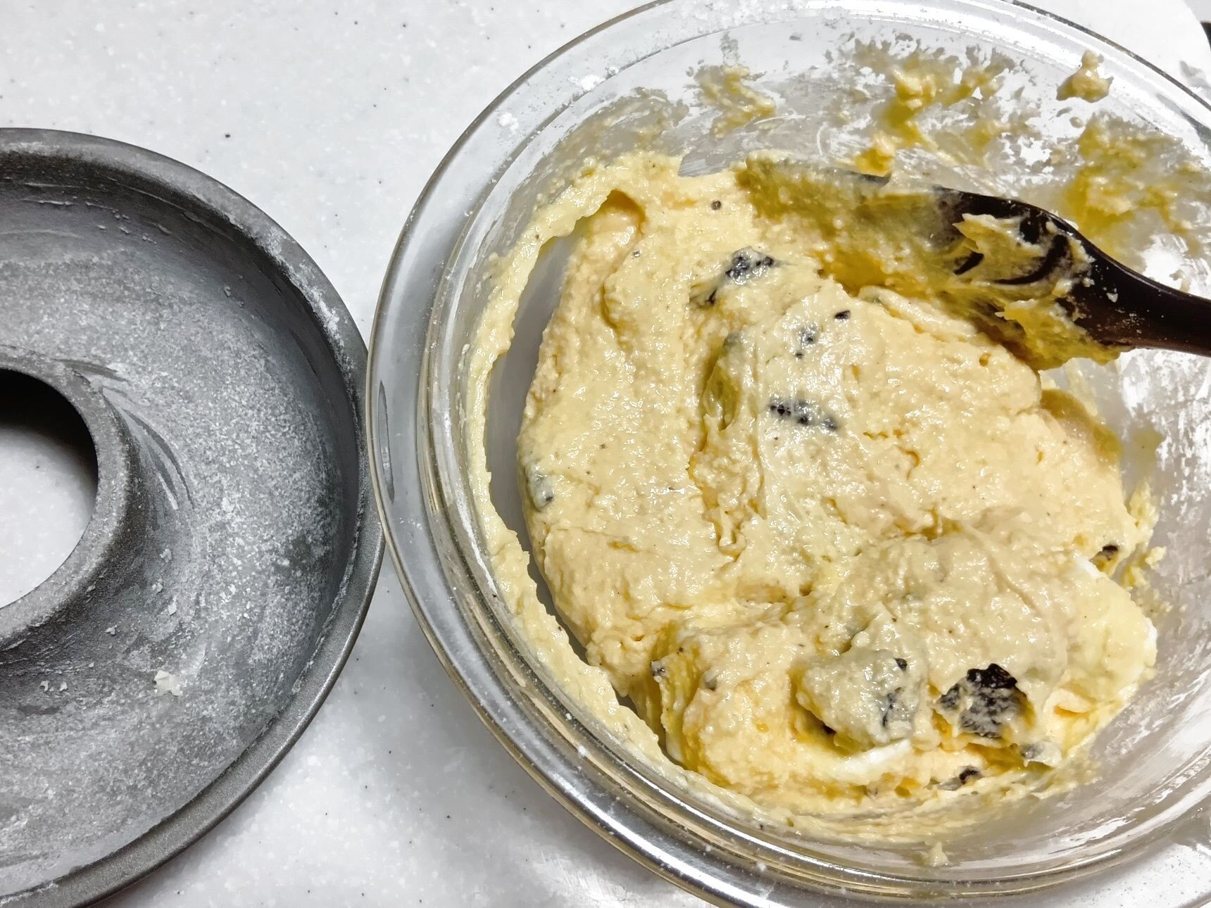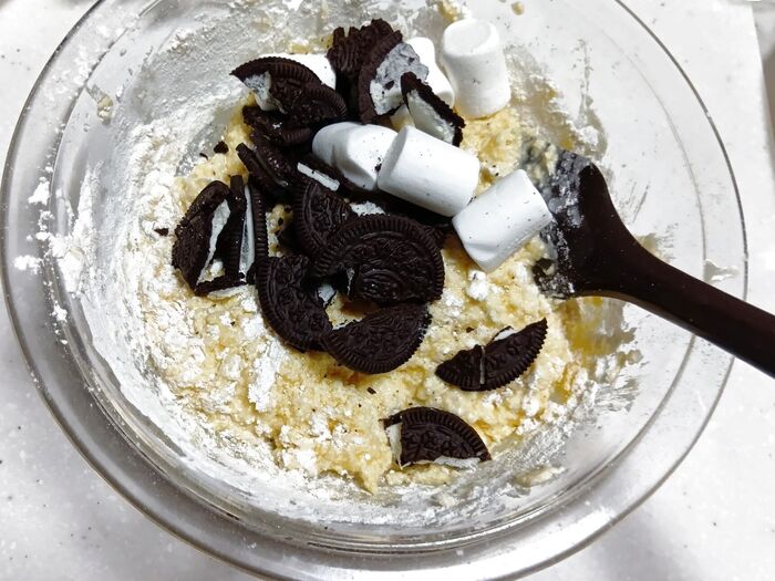 4.手で大き目に割ったオレオをマシュマロと共に、③に入れ、混ぜ合わせます。